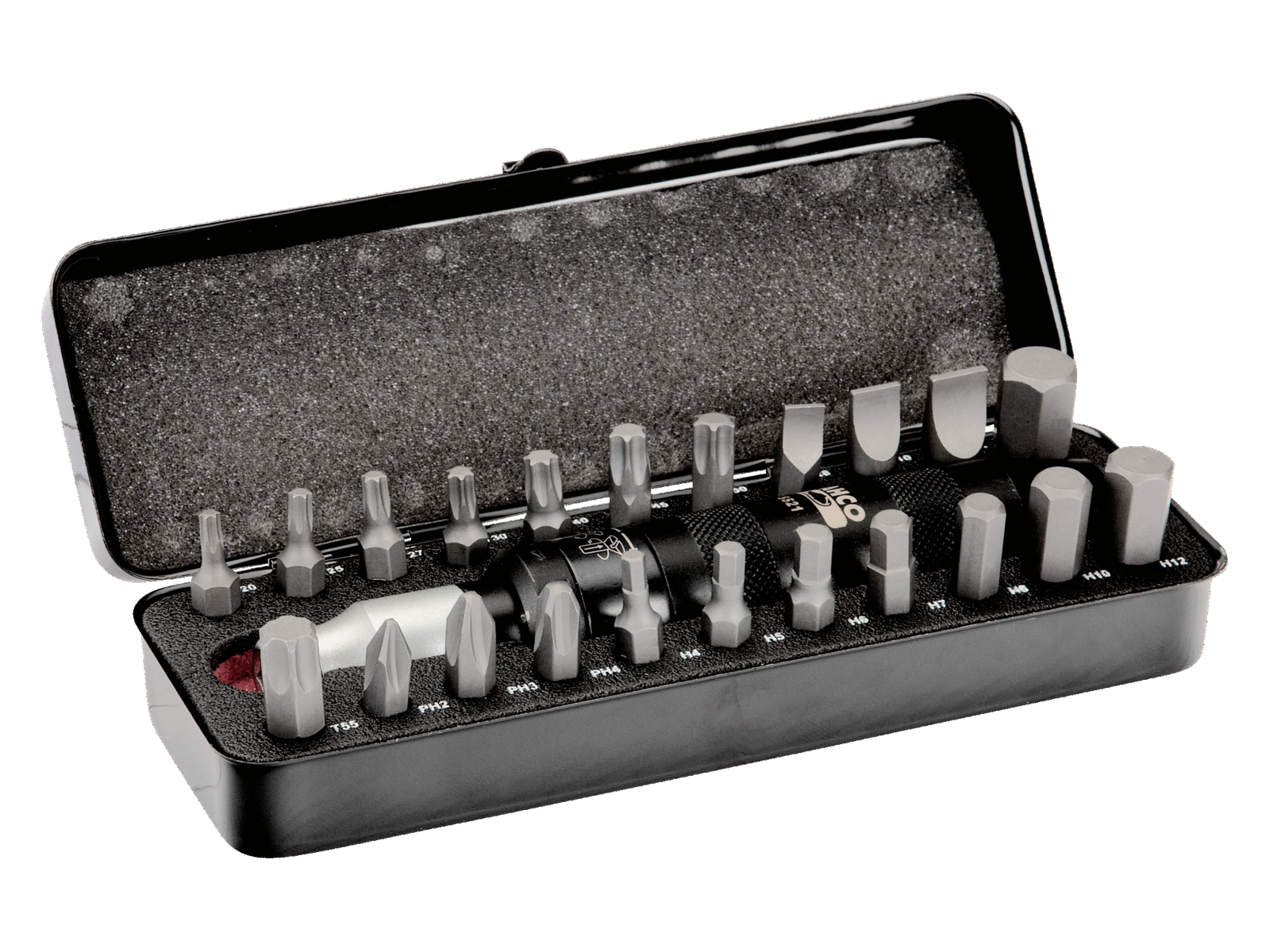 5/16" bitssæt med 23 dele (21 bits, 1 slagskruetrækker og 1 bitsholder) til slagskruetrækker til ligekærv-, Phillips- og Torx-skruer. Slagskruetrækker til 5/16" bits. 1/2" adapter til bits 5/16" udvendig sekskant. Robuste bits til løsning af fastklemte skruer eller møtrikker uden brug af elværktøj. Højtlegeret stål. Bits: ligekærv 1,2×8,0×41 mm, 1,6×10×41 mm, 2,0×12×41 mm, Phillips PH2, PH3, PH4, Torx T20, T25, T27, T30 og T40. Leveres i metalboks.