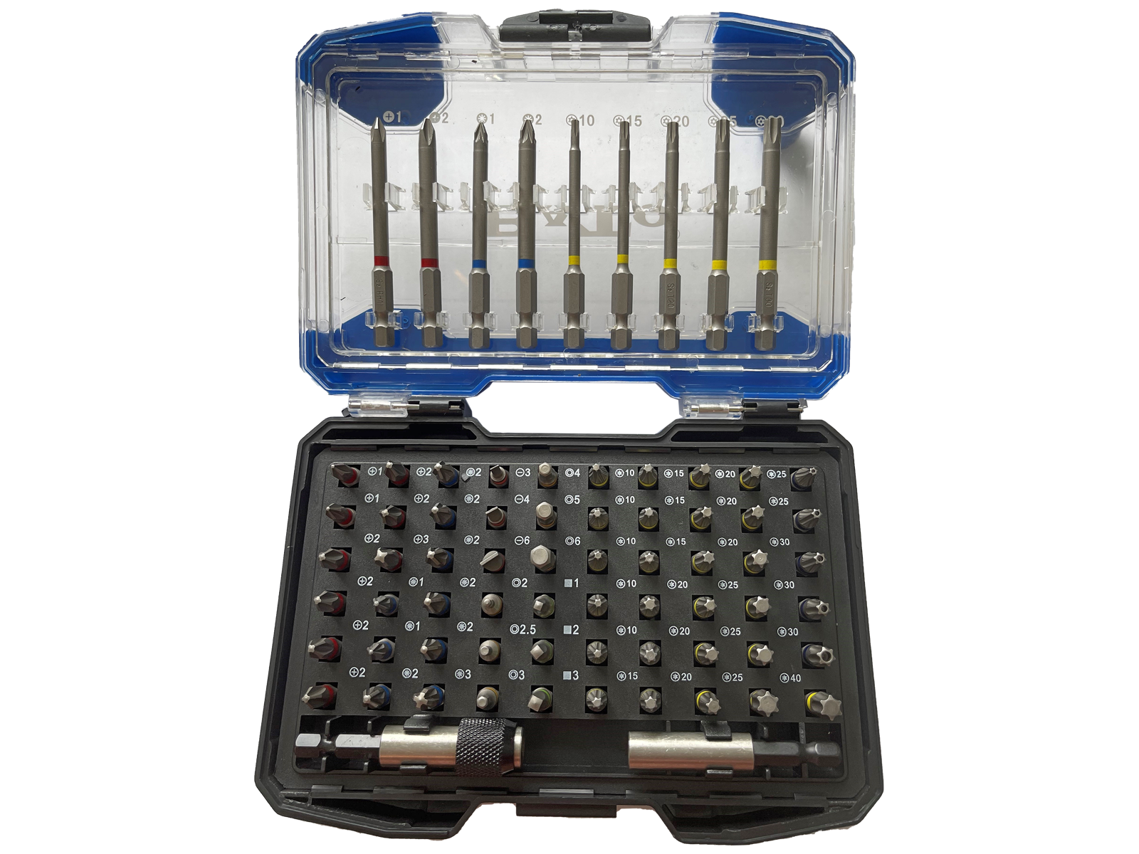 Bitssæt med 71 dele: 25 mm korte og 75 mm lange bits - og med farveringe.