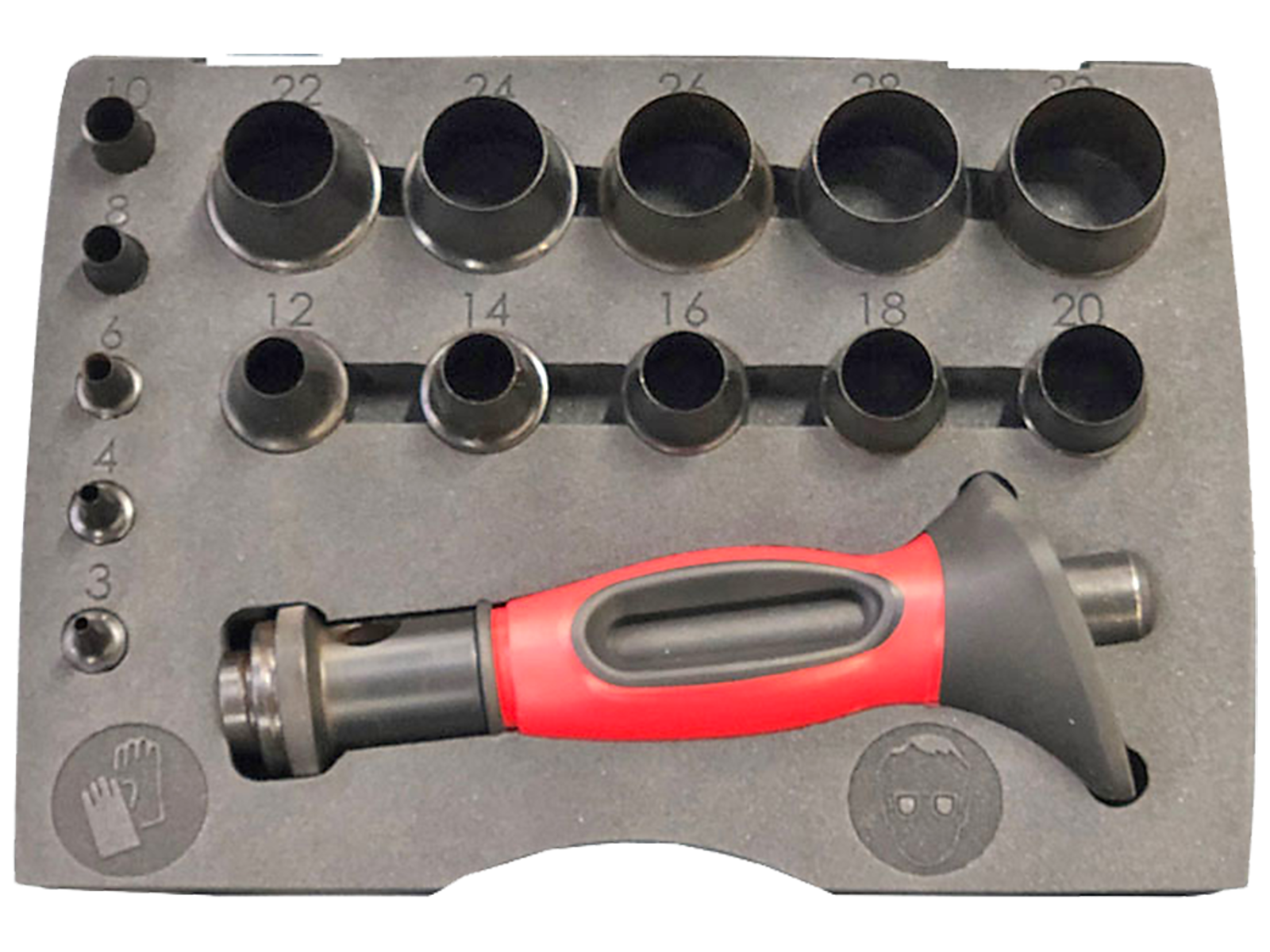 Huggepibesæt til udstansning i pap, plast, blødt plast, gummi, blødt gummi, forstærket gummi med magnet, aluminium (op til 0,3 mm tykkelse), læder, papirbånd, skum, kork, stof mv. Sættet indeholder 16 dele i størrelserne 3, 4, 6, 8, 10, 12, 14, 16, 18, 20, 22, 24, 26, 28 og 30 mm. Leveres samlet i praktisk æske.
