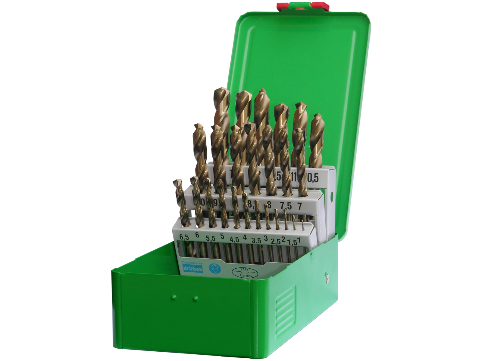 Borsæt med 25 stk. spiralbor (1-13 mm × 0,5 mm). Til boring i bl.a. stål, aluminium og rustfrit stål. Leveres i stålkassette.