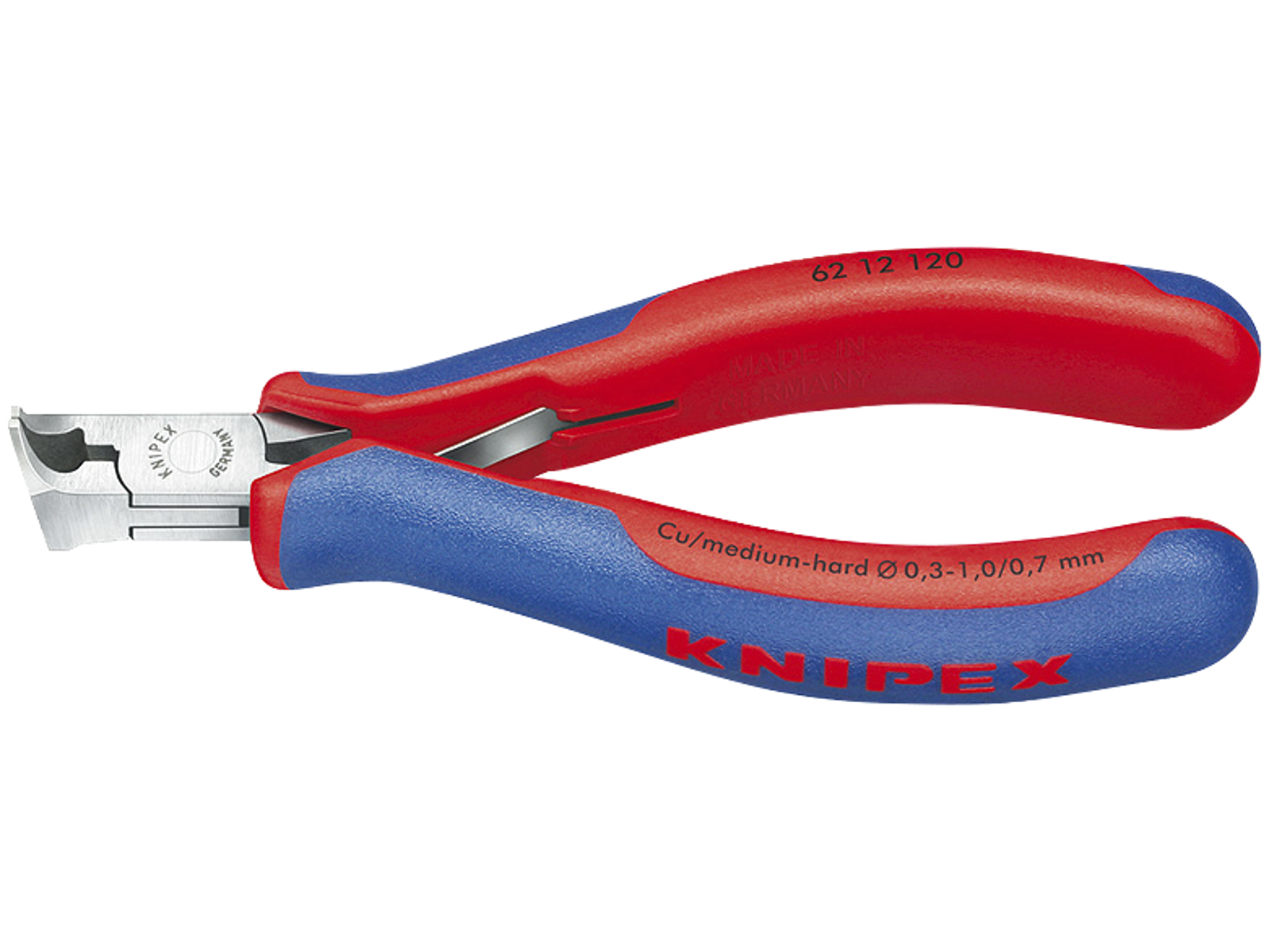 Elektronik-skråskærer med flerkomponent-håndtag 120 mm. Med skær til blød og mellemhård tråd. Uden facet, til plan afskæring. Skær yderligere induktivt hærdede, skærhårdhed ca. 58 HRC. Friktionsfattig dobbeltfjeder for blød og ensartet åbning. Gennemstukket præcisionsled. Polituren giver i forbindelse med en fin oliefilm en god rustbeskyttelse, så ingen forstyrrelser i koblingskredsløbet pga. af afskallende kromdele. Special-værktøjsstål af særlig kvalitet, smedet, oliehærdet.