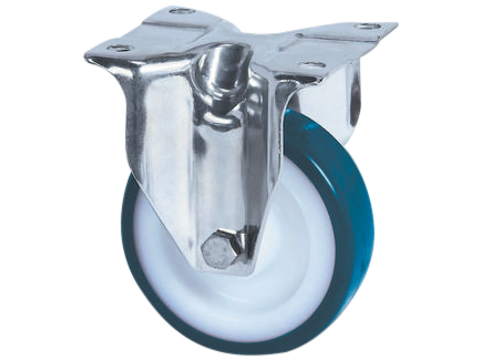 Fast transporthjul i rustfrit stål med bred gaffel samt nittet dobbelt kuglekrans. Nav i polyamide med polyuretan samt rustfrit rulleleje. Med pladebefæstigelse. Fås i flere dimensioner.
