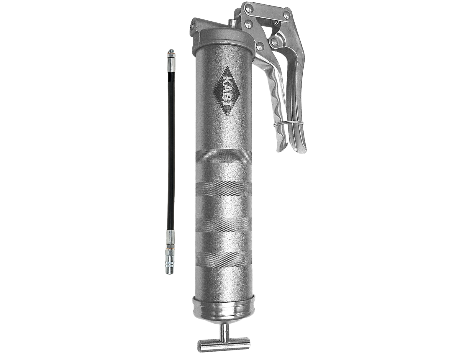 KABI enhånds fedtpresser 450. Kan anvendes til såvel patroner som løst fedt samt fyldning fra fedtfylder. Max. ydelse 345 Bar. Leverer ca. 0,5 g. pr. slag. Med 300 mm slange samt 4-bakket smørehoved. Tilslutningsgevind 1/8"R. Indhold 400/500 gram. Leveres i kartonæske.