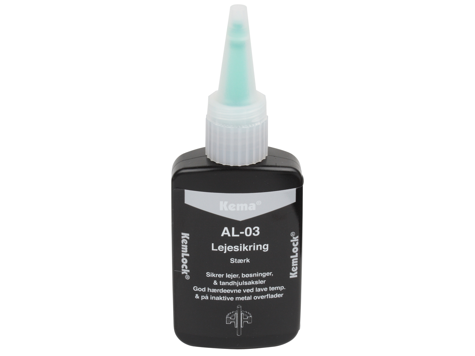 KemLock AL-serie Lejesikringer. Beskrivelse: KemLock Lejesikring anvendes til sikring af lejer, aksler, bøsninger, m.v. Forstærker prespasninger, tillader større mekaniske tolerancer samt tætner mod lækager. Pga. den lave dosering og den hurtige hærdetid er KemLock særdeles velegnet til samlebåndsproduktion. Stærk, til lejer, gear, aksler, cylindriske dele, vedhæftende på olierede overflader, produktet lever op til kravene i henhold til NSF/ANSI Standard 61.