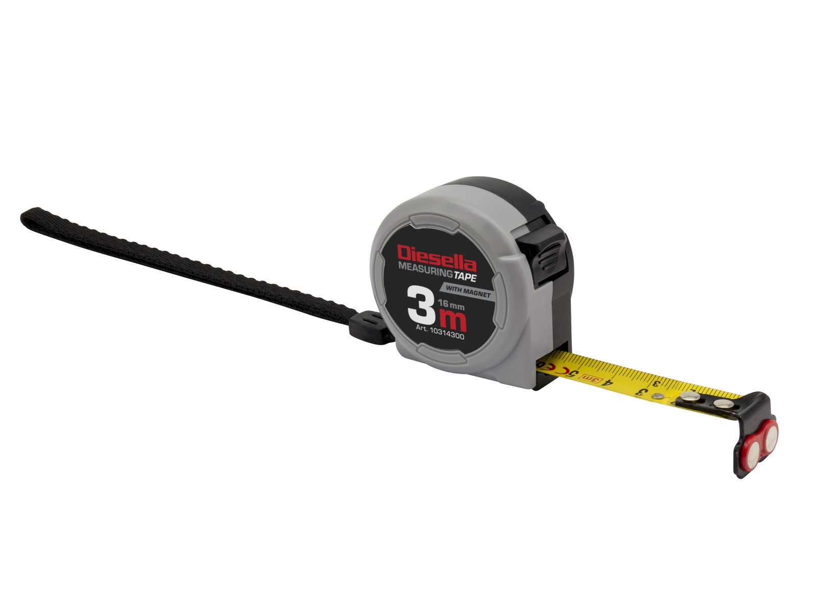 Meget kompakt og robust prof. båndmål med autolås. Med gult båndmål, sort mm-skala, røde tal for hver 10 cm og magnet. Tykkelse 0,125 mm.