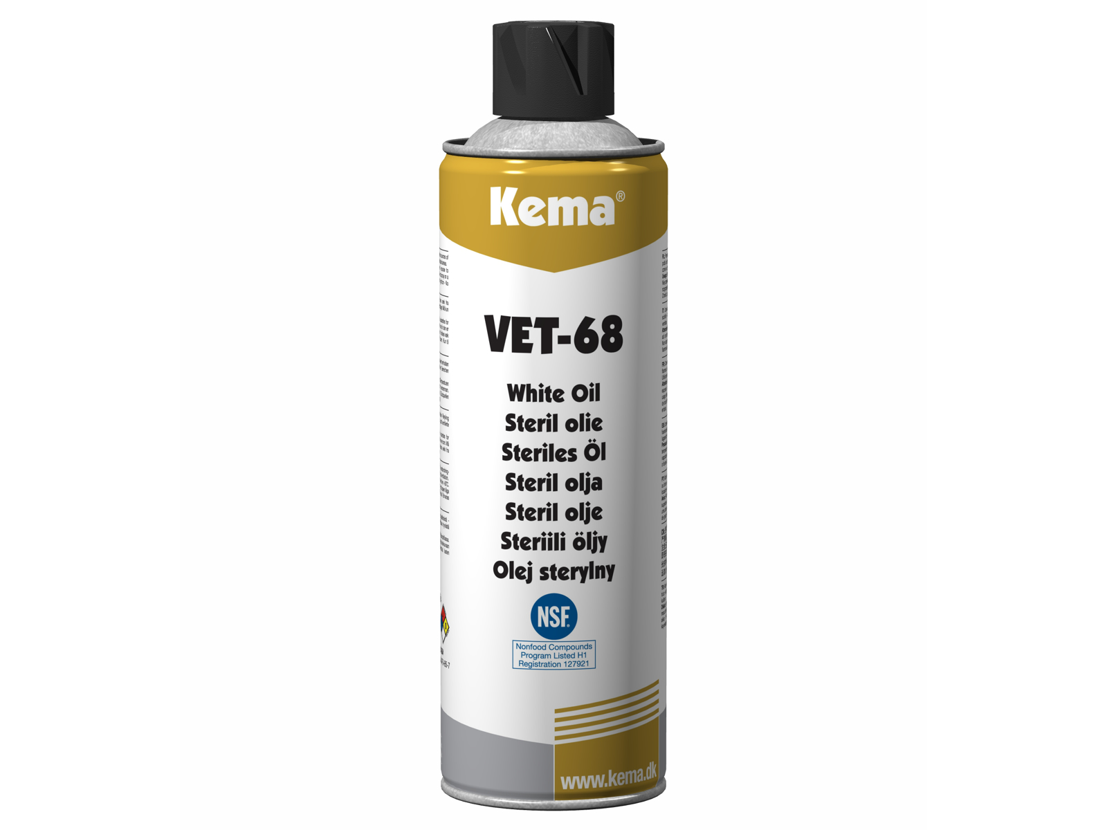 VET-68 er en speciel raffineret syrefri hvid olie, der opfylder de medicinske renhedskrav til brug indenfor fødevarevirksomheder, hospitaler og apoteker. Anvendes som smøremiddel til kæder, kabler, ruller, knaster, transportører, styreskinner, slæder, stempler, drejehjul, kæde- og tandhjul. Rustbeskytter og smører. VET-68 har en god vedhæftningsevne og kan tåle vand- og dampafskylning. Anvendes indenfor en lang række industrier, hvor der er behov for en helt farveløs olie samt til smøring i produktioner, hvor der ikke må forekomme misfarvning af færdigvarer. Anvendes endvidere indenfor tekstilindustrien samt i kosmetik-, medicinal- og fødevareindustrien, hvor der er store krav til hygiejnen, og hvor lejlighedsvis kontakt med fødevarer ikke kan udelukkes. Lever op til kravene i henhold til FDA 21 CFR 178.3570 til brug inden for fødevareindustrien og er registreret under NSF-H1. Egenskaber: NSF-registreret H1, allround smøremiddel, højt raffineret, beskytter mod rust, misfarver ikke færdigvarer, lugtfri, pharmacopeolie til fødevareindustrien, forurener ikke, farveløs og drypfri, vedhæftende - tåler vand- og dampafskylning fra -18°C til +185°C.