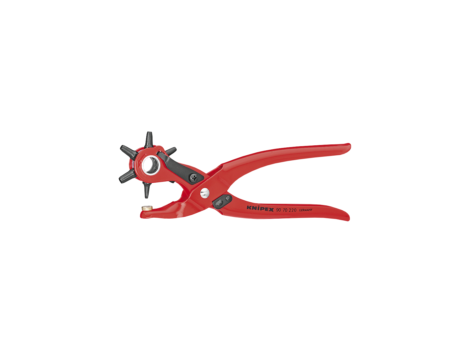 • Revolverhultang rødt pulvercoated 220 mm. Til at stanse huller i læder, tekstil- og kunststofmateriale. 6 dejelige hulpiber, Ø2,0 / 2,5 / 3,0 / 3,5 / 4,0 / 5,0 mm. Med åbningsfjeder og spærrepal. Pulvercoated for god rustbeskyttelse. Tangkrop og hulpiber i special-værktøjsstål, oliehærdet.