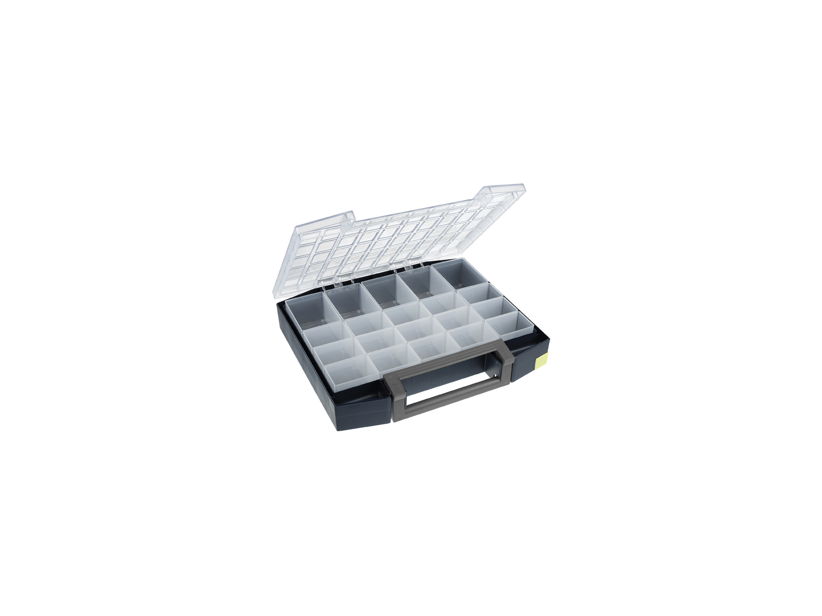 Sortimentsæske med 20 udtagelige indsatse til smådele: 15 × BA8-1 , 5 × BA7-1. Med kombineret lukke og låse mekanisme.