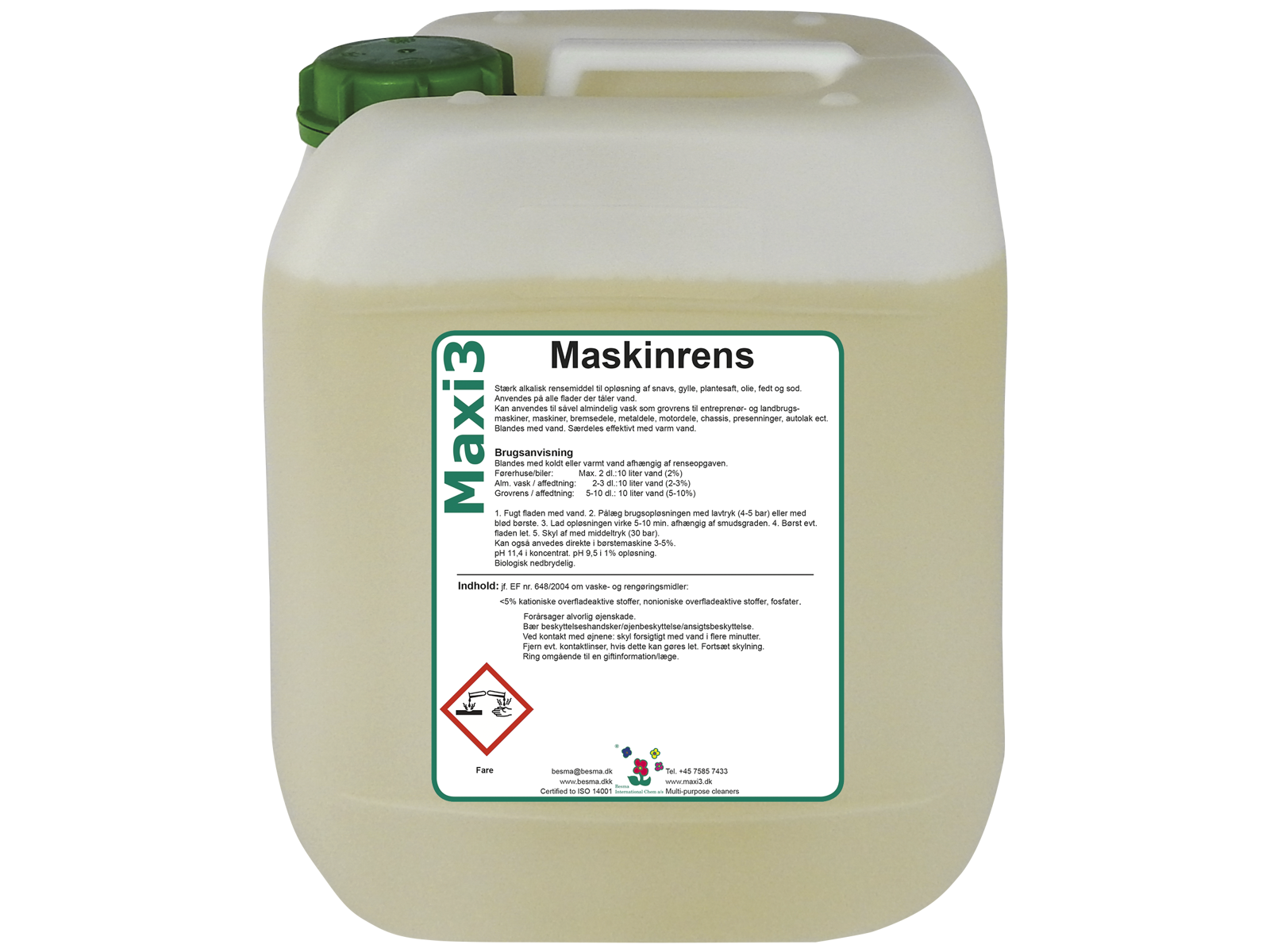 • Maxi 3 Maskinrens er et stærk alkalisk rensemiddel til opløsning af snavs, gylle, plantesaft, olie, fedt og sod. Anvendes på alle flader der tåler vand. Kan anvendes til såvel almindelig vask som grovrens på landbrugsmaskiner, maskiner, bremsedele, metaldele, motordele, chassis, presenninger, autolak etc. Blandes med vand - særdeles effektivt med varmt vand. Let biologisk nedbrydeligt. pH-værdi koncentreret 11,4 og pH-værdi i 1 % opløsning 9,5.
