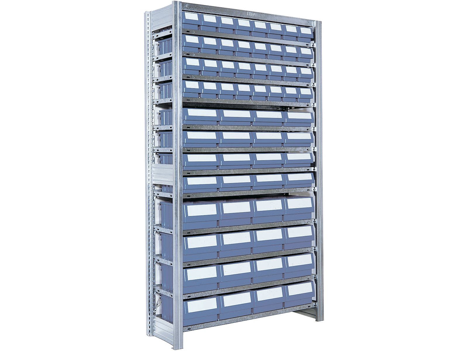 Nemt kliksystem - Hurtig og nem montage uden skruer. Reolkasserne er optimalt tilpasset hylderne og har høj stabilitet, stor indvendig volumen og kan inddeles. Hyldehøjden kan justeres pr. 25 mm. Reolerne kan udbygges. Alle reoldele i blankforzinket stål. Plastik