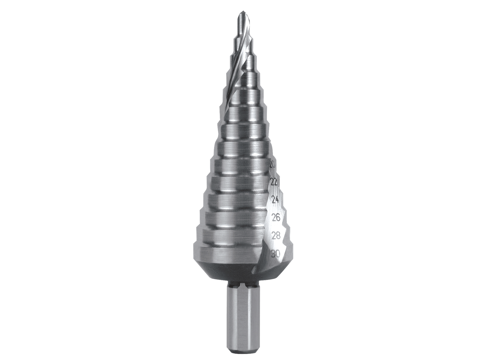 Trinbor HSS Co5. Den dybslebet og spiralsnoet spånkanal giver et helt roligt løb og samtidig en meget stor skærekapacitet. Især ikke brækkende spåner transporteres meget let væk, akkurat som på et spiralbor. Dette formindsker samtidig at affald og koldsvejsninger sætter sig på skæret. Konussen for enden af trinboret letter tilbagetrækningen ved gennemboring af pladen. Anvendes til rustfrit stål, højkromlegeret stål så som V2A og V4A. Fås i flere størrelser.