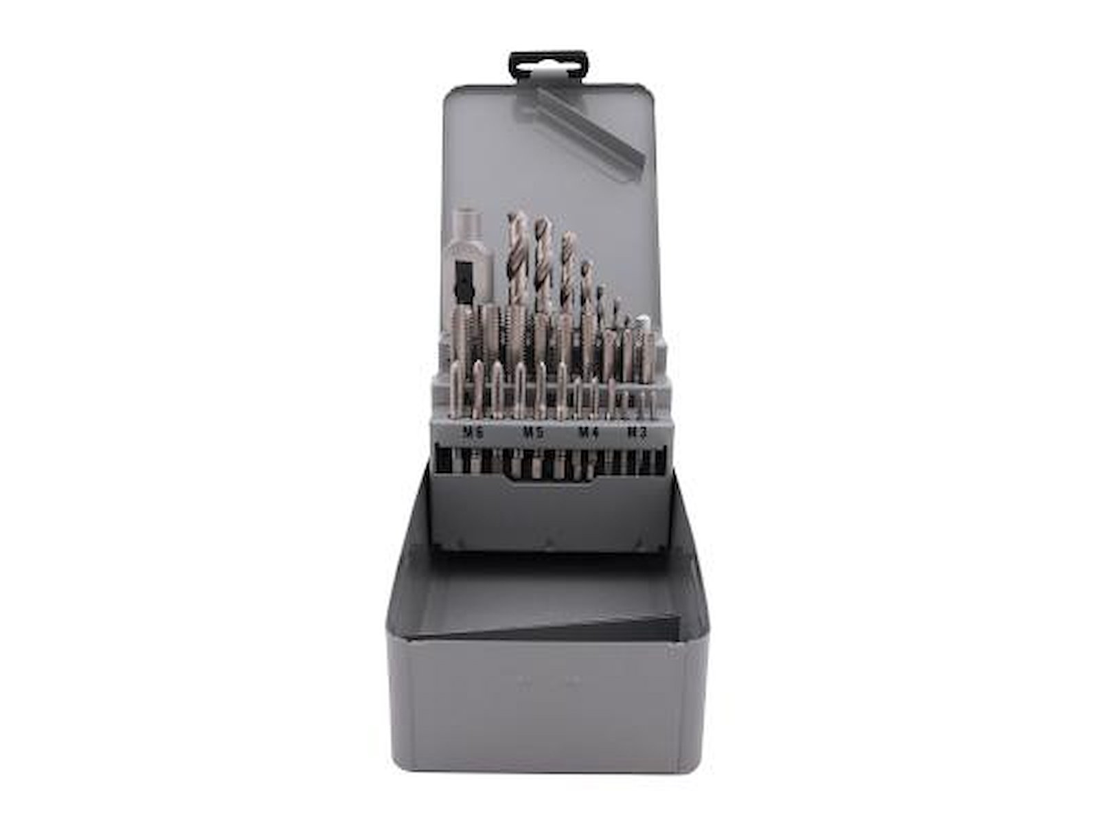 • Snittapsæt indeholdende 1 stk. vindejern M3-M12, 7 stk. bor ø2,5 - 3,3 - 4,2 - 5,0 - 6,8 - 8,5 og 10,2 mm samt 7 stk. håndtappe M3 - M4 - M5 - M6 - M8 - M10 og M12. Spids, mellem og bund. Fremstillet af højhastighedsstål. Leveres i stålkassette.