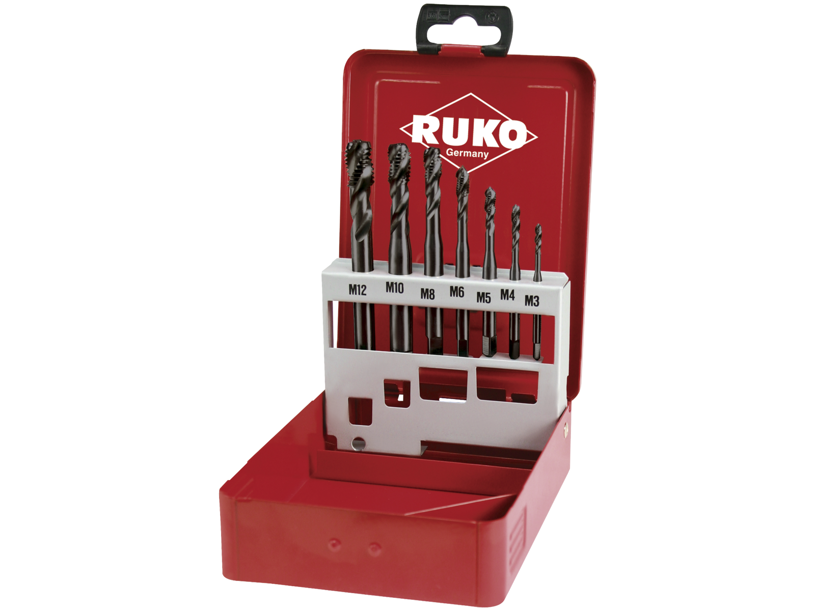 Sæt med 7 spånbrydertappe HSS M3, M4, M5, M6, M8, M10, M12 mm i stålkassette. Maskinsnittappe af højpræstations-hurtigstål. Til gennemgangsgevind i ulegeret stål op til 800 N/mm² styrke. Gevindet bliver skåret i en arbejdsgang.
