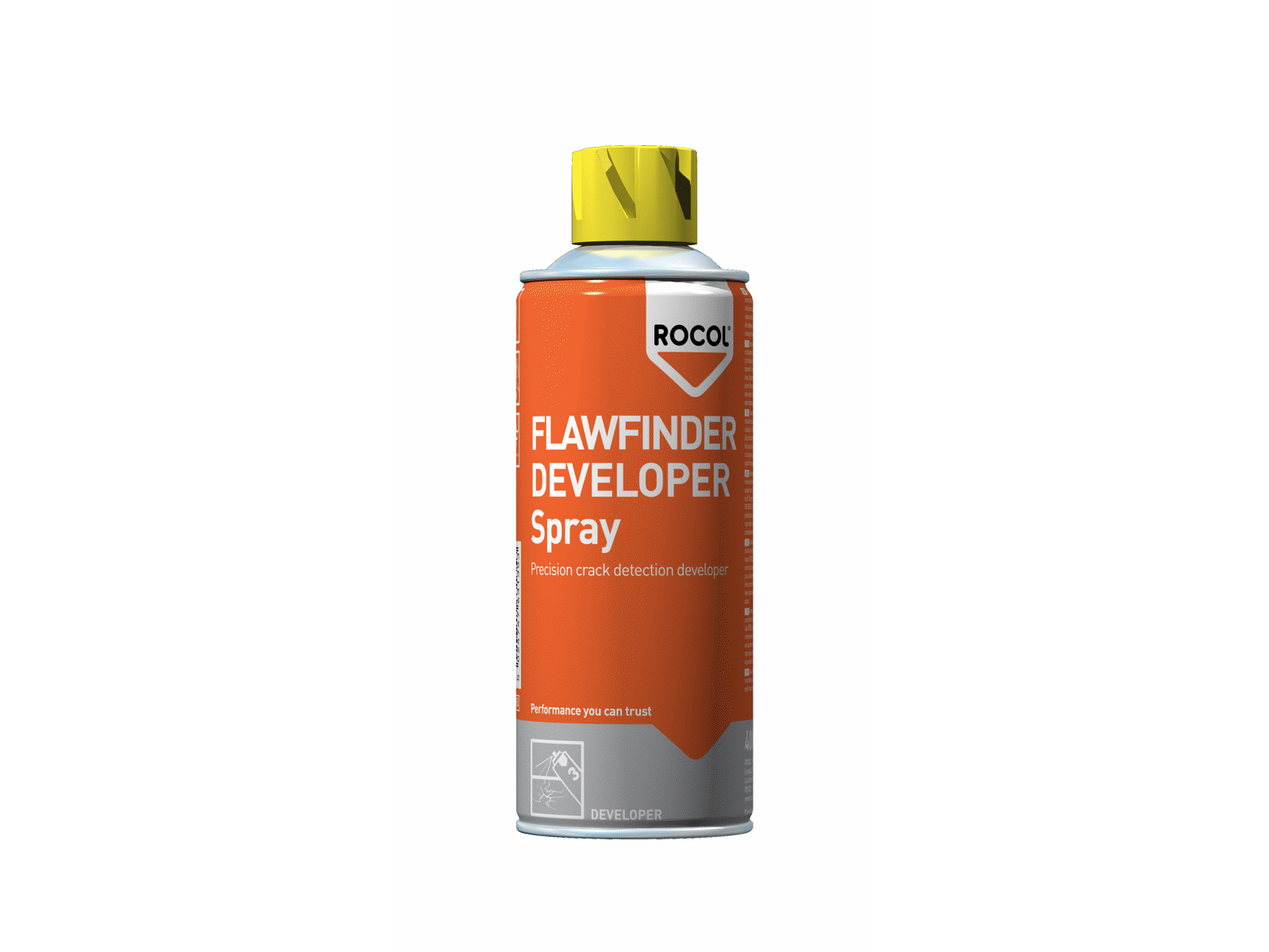 ROCOL FLAWFINDER DEVELOPER spray er tilsat hvidt pulver som er designet til detektion af kritiske fejl og revner. Anvendes sammen med FLAWFINDER DYE PENETRANT og FLAWFINDER CLEANER spray. Sprayes på efter Dye Penetrant. Skal sidde mindst 10 min. før inspektion i dagslys. Hvor farven trænger igennem, vil der være fejl eller revner i overfladen. Anvendes sammen med øvrige produkter i revnesøger serien.