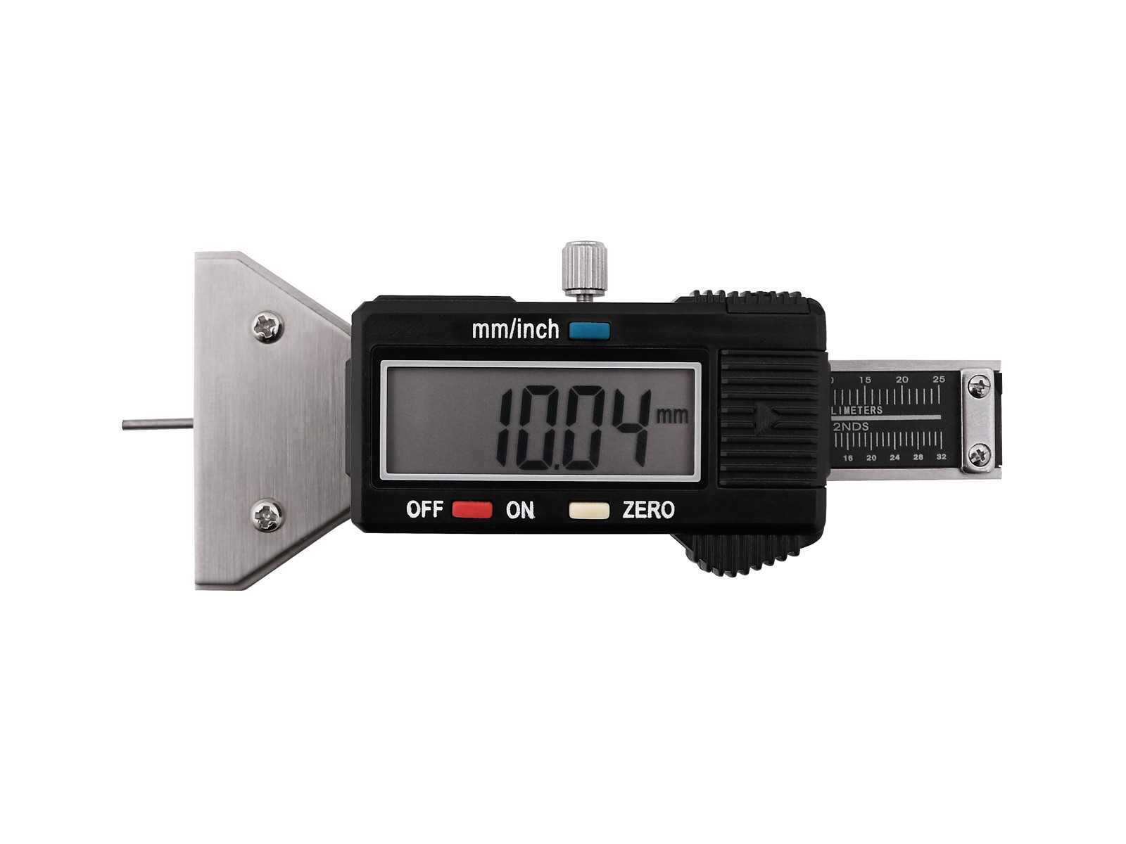 Kraftig digital dækprofilmåler, til sikker kontrol af dækslid, rustfri skala, 0-25 mm, Bro 45x7 mm. Funktioner: Med nulstilling og automatisk tænd og sluk efter 10 min. Vælg mellem mm eller tommer. LCD display. Batteri: 1xLR44 medfølger.
