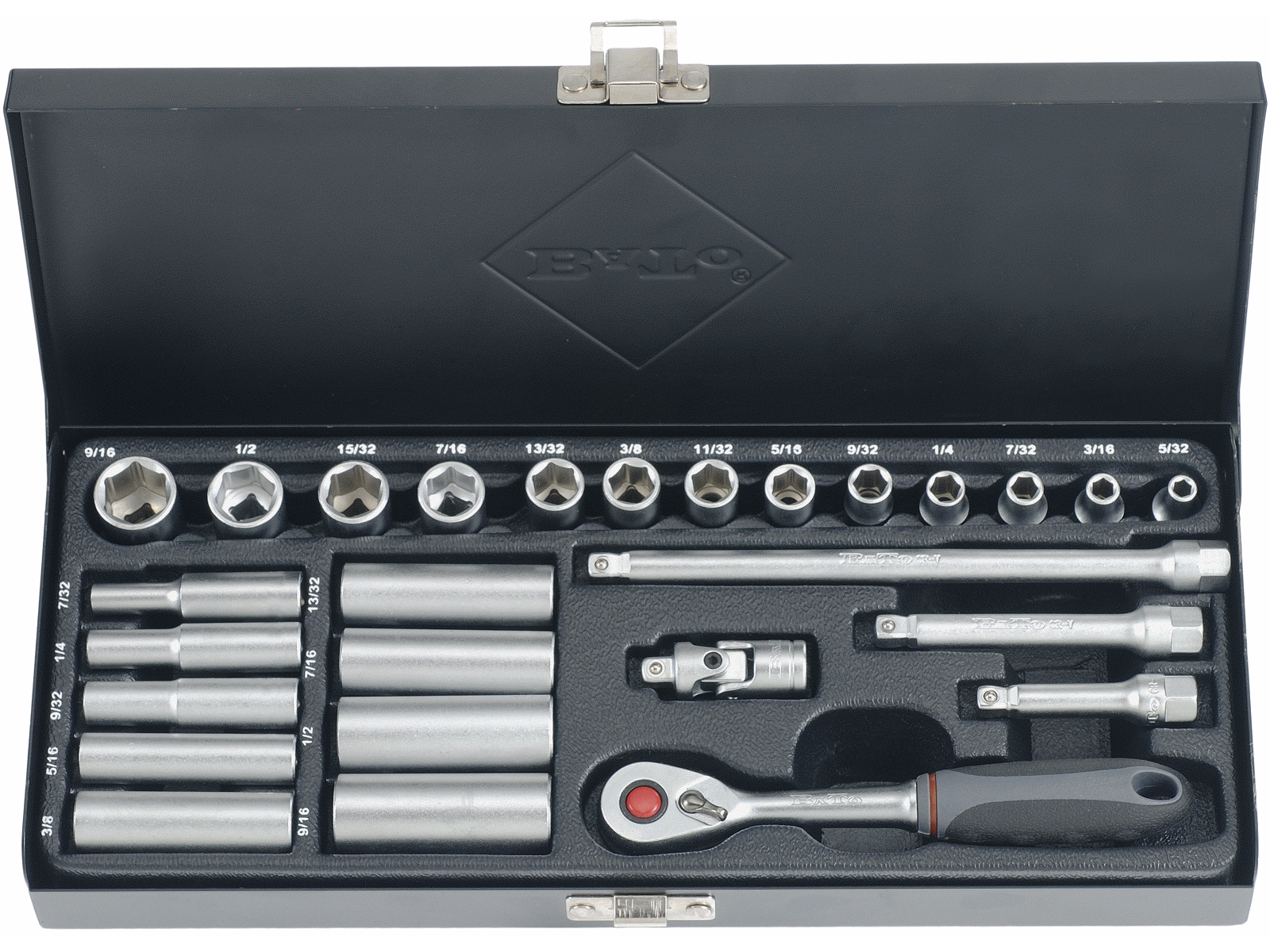 Topnøglesæt med 27 dele. 1/4" 6kt toppe i kort (5/32" - 9/16") og lang (1/4" - 9/16") udgave, forlængere med Wobble hhv. 50, 75 og 150 mm, kardanled samt 48-tands skraldenøgle med udløser. Leveres i metalboks.