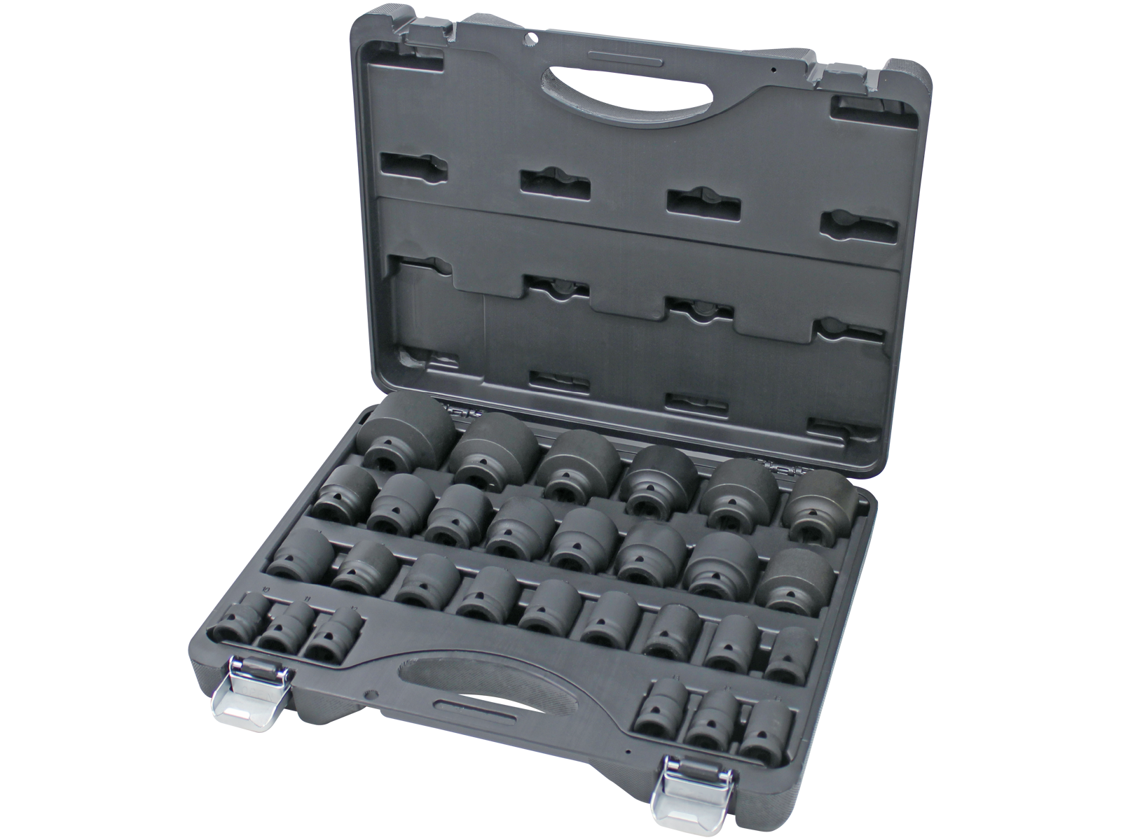 1/2" krafttopsæt med 29 dele. Indeholder korte toppe i dimensionerne: 10-11-12-13-14-15-16-17-18-19-20-21-22-23-24-25-26-27-28-29-30-32-33-34-35-36-38-41-46 mm. Leveres i praktisk kuffert.