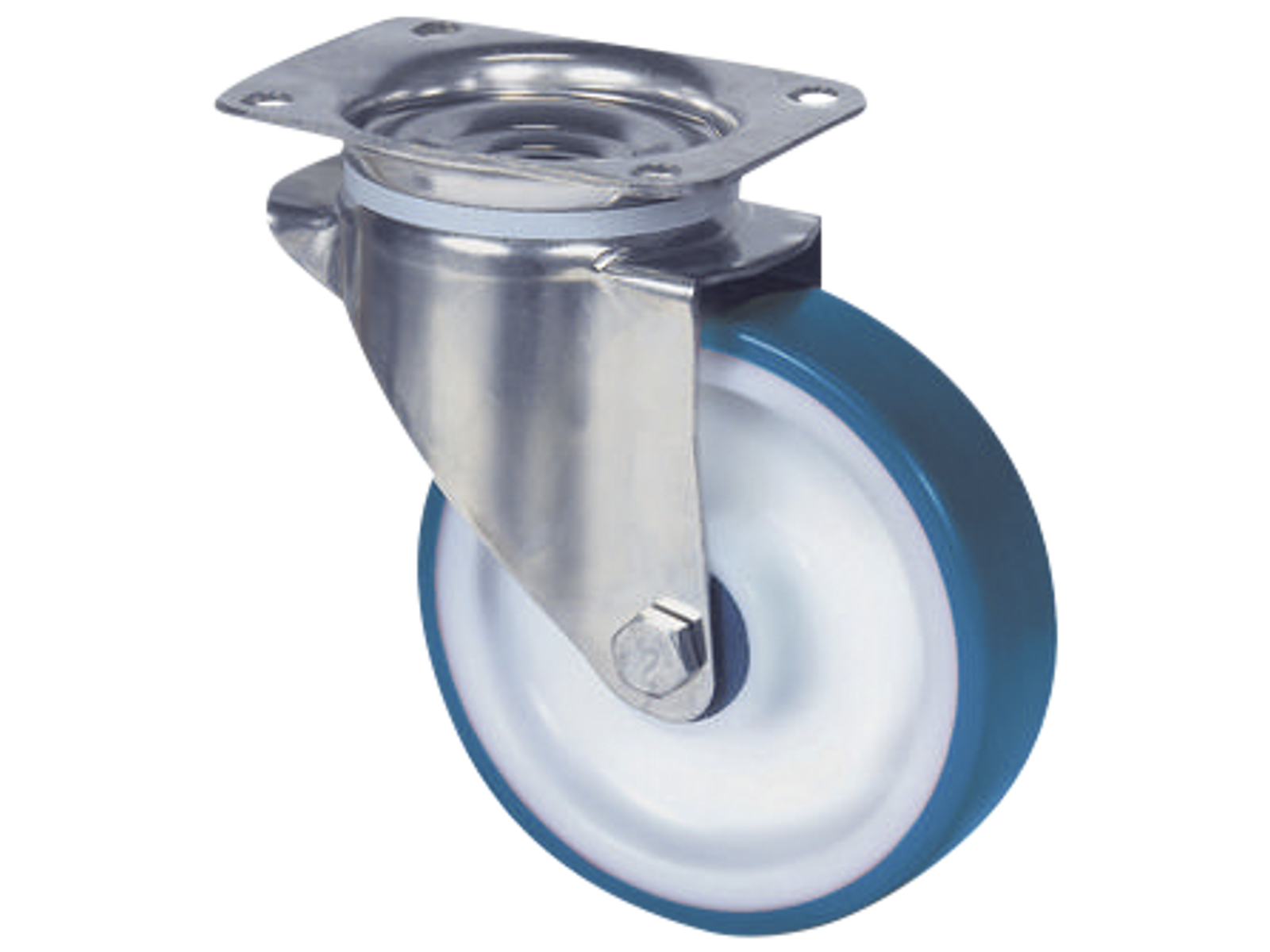 Drejeligt transporthjul i rustfri med bred gaffel og nittet dobbelt kuglekrans. Nav i polyamide med polyuretan hjulbane og rustfrit rulleleje. Med centerhul- eller pladebefæstigelse. Fås i flere dimensioner.