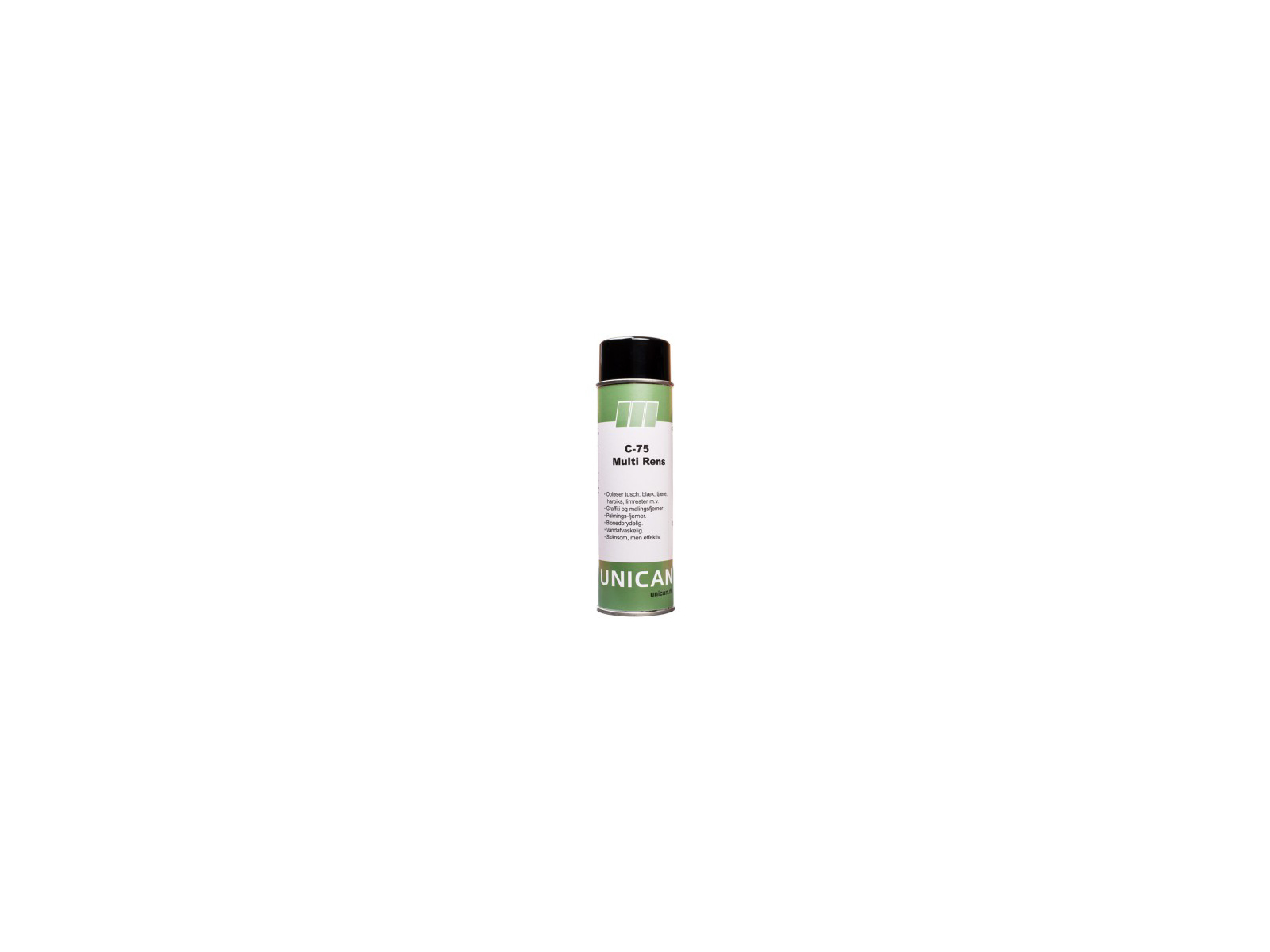 Multirens er et allround affedtningsprodukt, som på grund af dens alsidighed kan løse en lang række yderst krævende affedtningsopgaver i industrien. C-75 Multirens er skånsom overfor langt de fleste overflader, men kan angribe visse lak, gummi og plast-typer. Foretag derfor altid test før brug. C-75 Multirens fjerner effektivt fedt, snavs, tusch, blæk, tjære, harpiks samt paknings-rester og ikke hærdede klæbestoffer. C-75 Multirens påføres i en afstand på 25-30 cm. Lad produktet virke i 5-10 minutter. Afvask efterfølgende med vand eller aftør med ren tør klud.