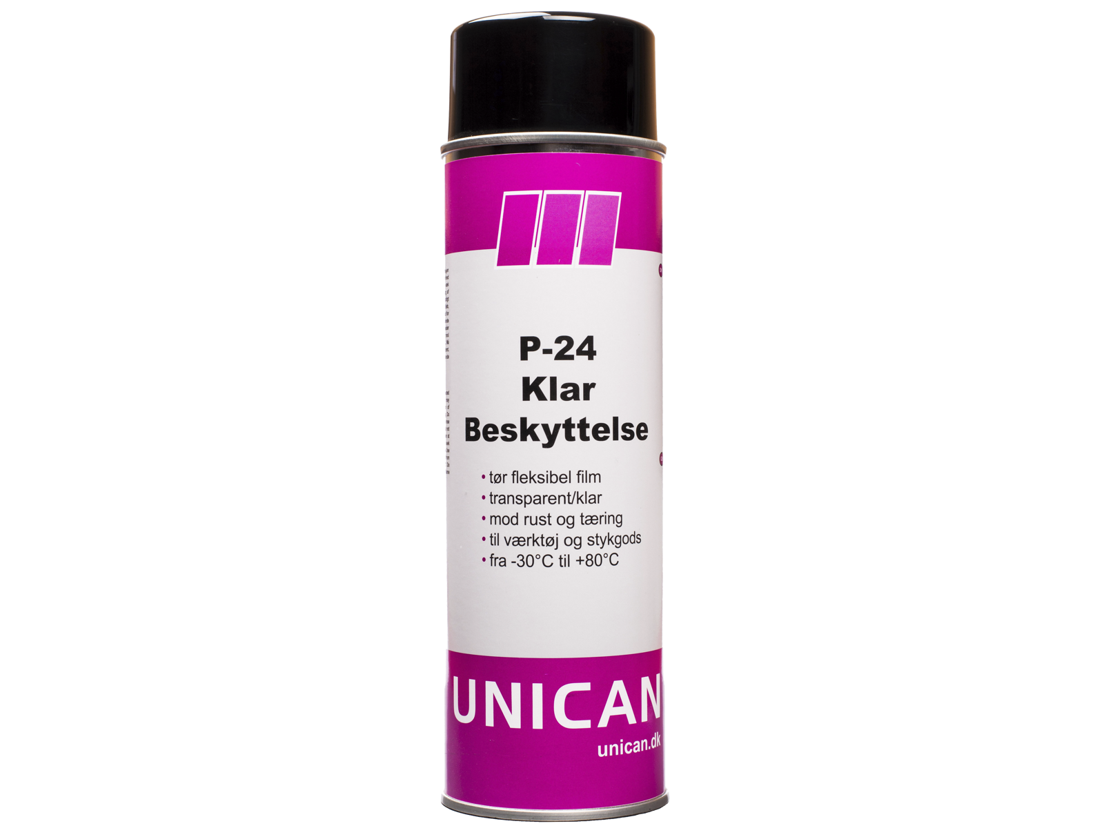 P-24 Klar Beskyttelse er en transparent flydende voks, der lægger et voks-overtræk til beskyttelse af metaloverflader, hulrum samt på og i genstande eller steder, hvor en effektiv anti-rust forebyggelse er påkrævet. Produktet er vandafvisende og har fremragende gennemtrængende egenskaber og en "selvhelende" effekt. Efter tørring efterlader P-24 en svagt klæbende voksagtig belægning. Denne belægning har en god termisk stabilitet op til ca. 180°C og kan derfor anvendes i rum med høje temperaturer. Når P-24 er tørret og efterfølgende opvarmes af solvarme eller anden varmepåvirkning afgiver den ikke den typiske lugt af konventionelle voksagtige korrosions-sikringssystemer. P-24 er drypfri en time efter påføring. Produktet kan hvis det ønskes fjernes med C-1000, C-60, C-18, C-700 og C-800.