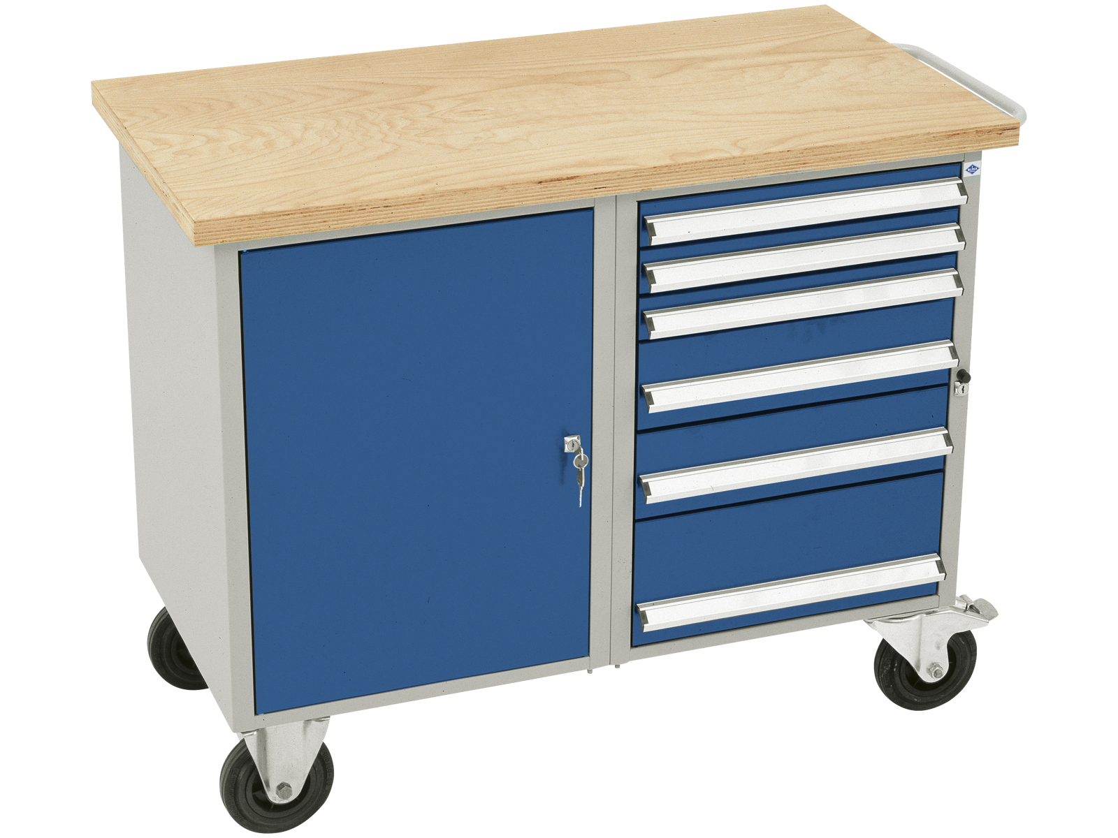 • Værkstedsvogn med multiplex-bordplade samt hjul (2 faste og 2 drejelige med bremse). Skuffeskabssektion bestående af seks skuffer på stålkuglelejer med 100 % udtræk, centrallås for alle seks skuffer samt enkelt skuffespærre. Skabssektion bestående af et værktøjsskab med en flytbar galvaniseret hylde (belastning 30 kg). Låsene i de to sektioner er enslukkende. Belastning pr. skuffe 45 kg. Belastning af hele vognen ved bremset tilstand 1.000 kg og i bevægelse 500 kg.