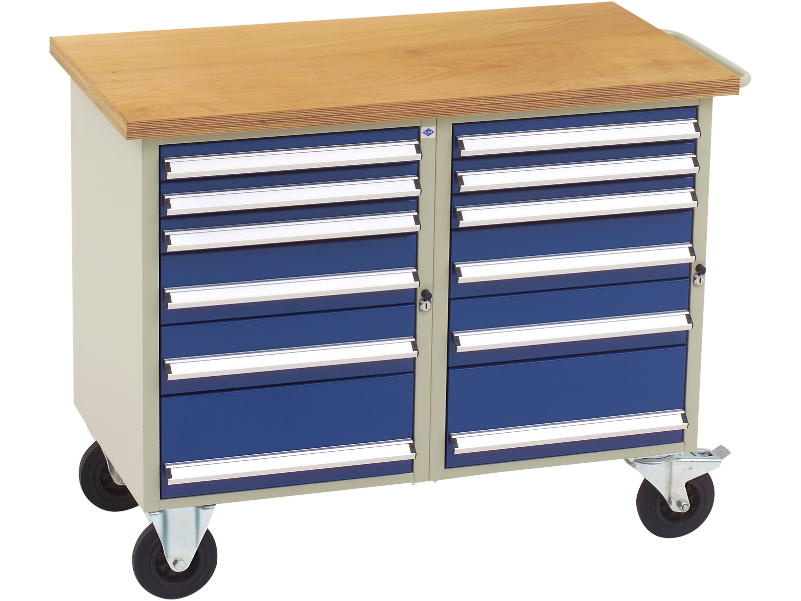 • Værkstedsvogn med multiplex-bordplade samt hjul (2 faste og 2 drejelige med bremse). Skuffeskabssektion bestående af seks skuffer på stålkuglelejer med 100 % udtræk, centrallås for alle seks skuffer samt enkelt skuffespærre. Skabssektion bestående af et værktøjsskab med en flytbar galvaniseret hylde (belastning 30 kg). Låsene i de to sektioner er enslukkende. Belastning pr. skuffe 45 kg. Belastning af hele vognen ved bremset tilstand 1.000 kg og i bevægelse 500 kg.