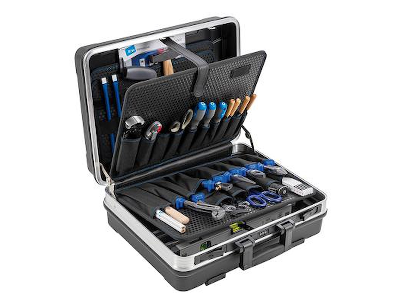Praktisk og funktionel værktøjskuffert i ABS-plast med aluminiumsramme som gør den robust. Indeni er kufferten udstyret med en lomme med plads til dokumenter, to aftagelige værktøjstavler med lommer til værktøjet samt en bund med et aluminium opdelingssystem, som kan tilpasses individuelt. Kufferten er desuden udstyret med kombinationslås samt en robust metallås, så indholdet kan sikres. Volume 28,1 ltr. 37 værktøjslommer. Maks. belastning 25 kg. Leveres uden værktøj.