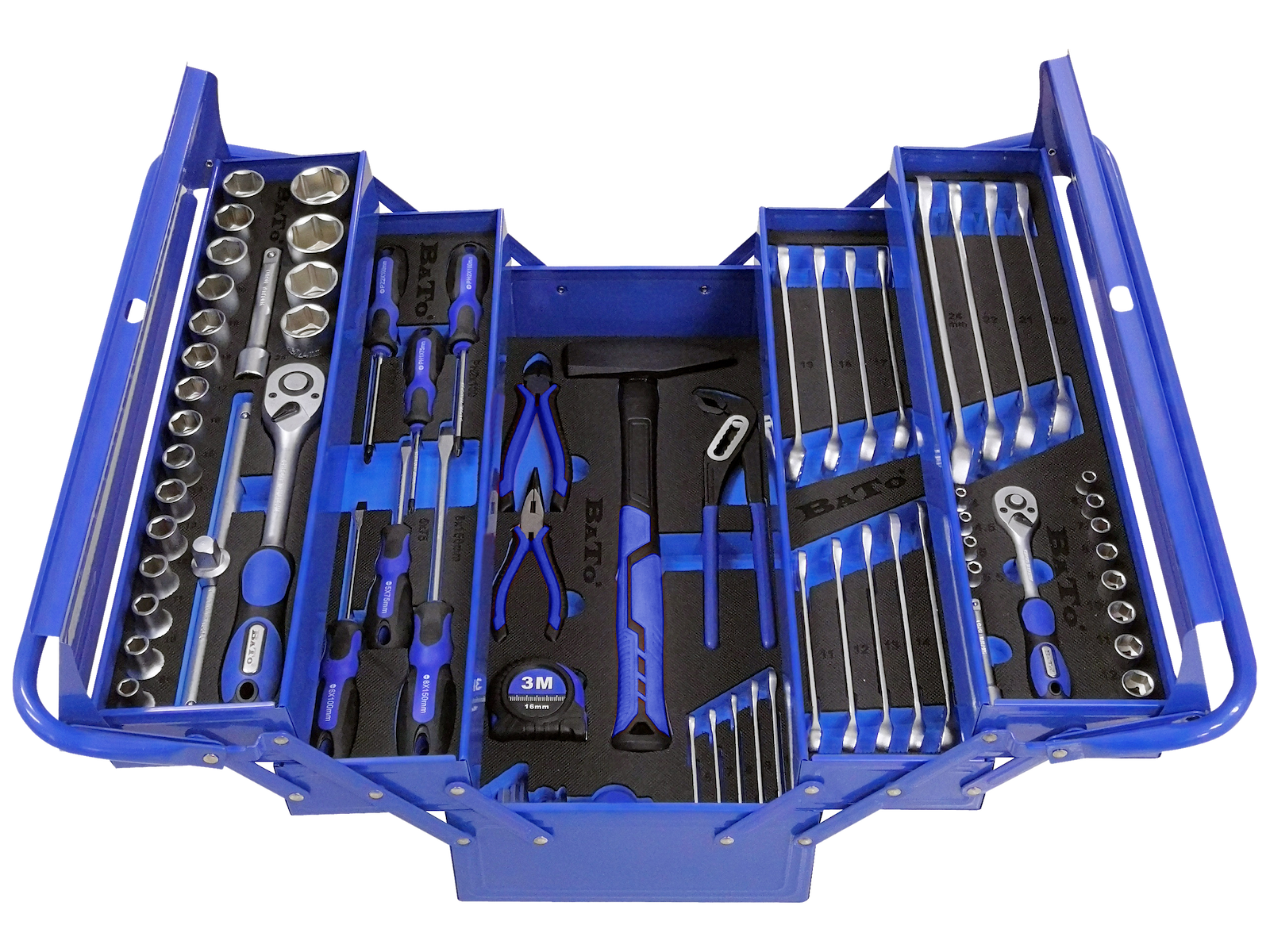 Bato værktøjskassesæt med 75 dele i 5 rums metalkasse som måler 480×230×230 mm. Alt ligger i EVA skum. Indeholder korte 1/2" toppe i størrelserne 8-9-10-11-12-13-14-15-16-17-18-19-21-22-24-27-30-32 mm. Skraldenøgle 1/2" 72T, forlænger 1/2"×125 mm 1/2"×250 mm. Korte 1/4" toppe i størrelserne 4-4,5-5-5,5-6-7-8-9-10-11-12-13 mm, forlænger 1/4"×75 mm. Skraldenøgle 1/4" 72T. Ringgaffelnøgler i størrelserne 6-7-8-9-10-11-12-13-14-15-16-17-18-19-20-21-22-24 mm. Stiftenøglesæt i størrelserne 1,5-2-2,5-3-4-5-5,5-6-8-10 mm. Sideafbider 160 mm, spidstang lige 160 mm, vandpumpetang 250 mm. Skruetrækkere i størrelserne 5,0×75, 6,0×100, 8,0×150, PH1×75, PH2×100, PZ2×100 mm samt fiberhammer 1000 g.