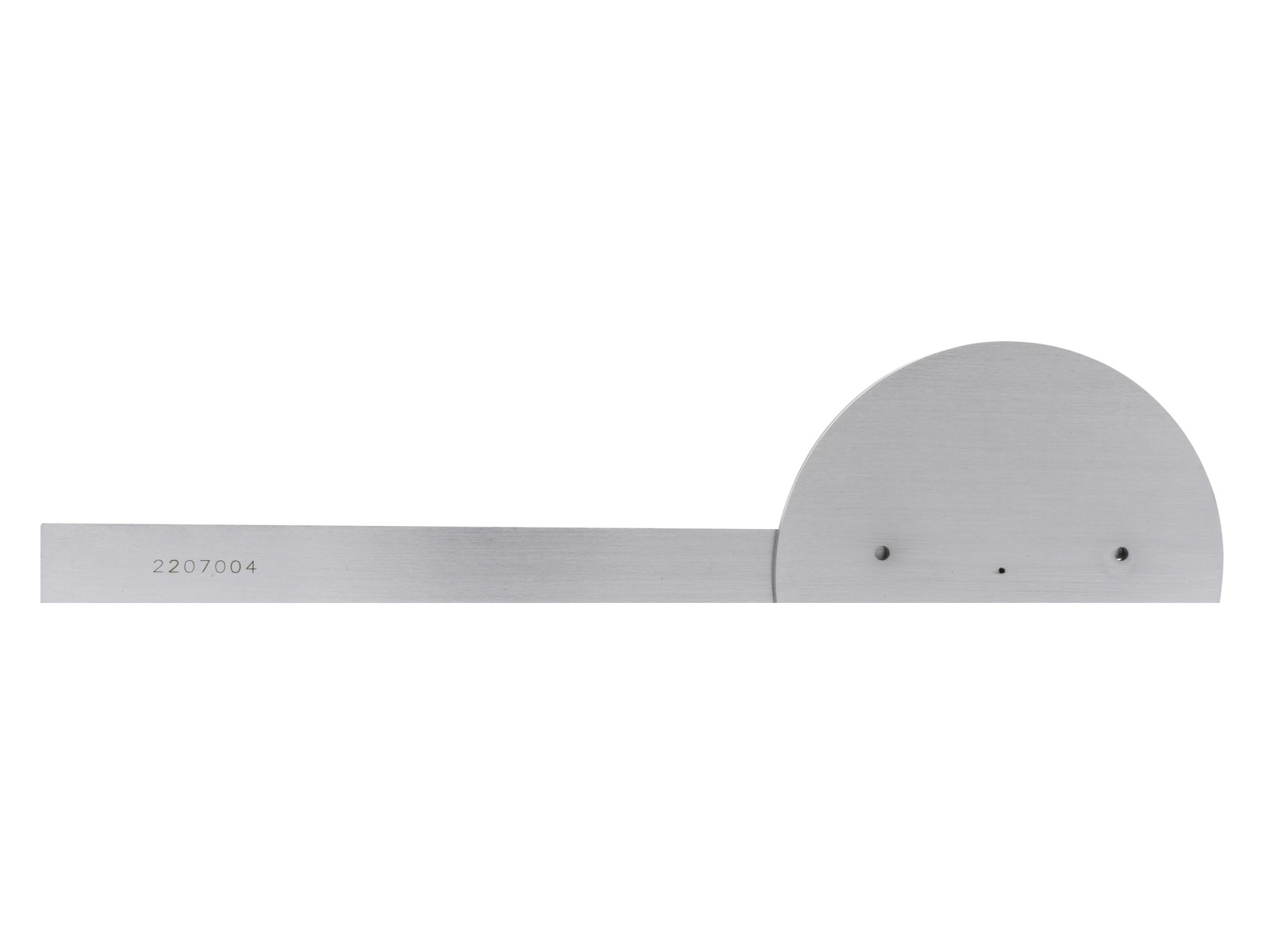 Gradmåler med spændemøtrik og en solid halvcirkulær bue med inddeling 0-180° og opløsning på 1°. Blændfri, forkromet skalaplade.