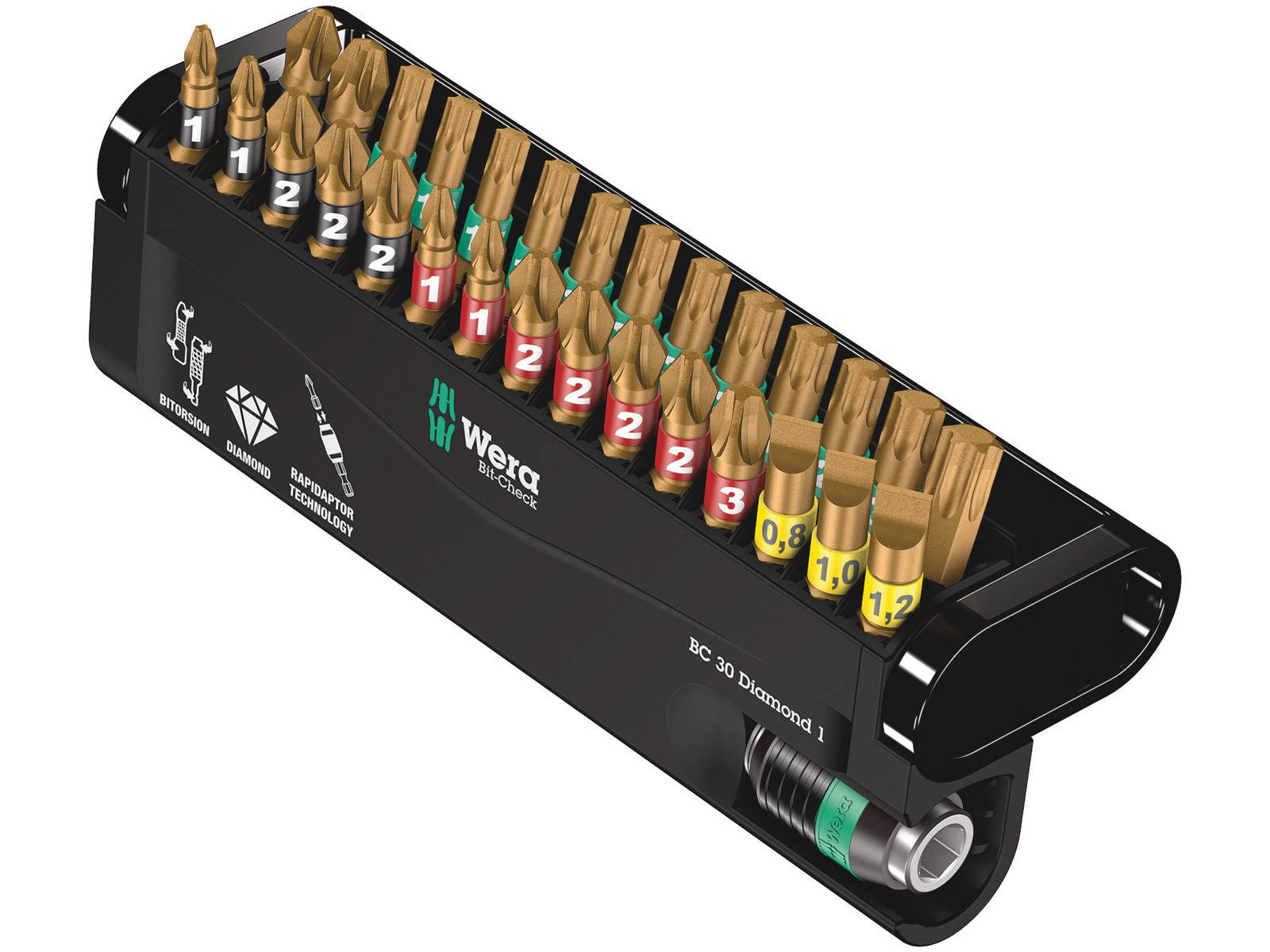 Bits med bittesmå diamantpartikler på bitspidsen. De sørger for sikker placering i skruen, nedsætter det krævede tryk på skruen og nedsætter faren for at rutsje af skruen. BiTorsion bits med torsionszone, som der afledes kinetisk energi til ved belastningstoppe. Derved signifikant forøgelse af produktlevetiden. Udstyret med Rapidaptor-teknologi, der muliggør isætning af bits også uden at røre bøsningen. Udtagning af bits foregår ved enkel skyden-fremefter - til lynhurtigt bitskift, også med kun en hånd. Til isætning i skruemaskine eller i borepatronen på en elektronisk boremaskine. Flerkomponent Bit-Check overbeviser ved ringe vægt og størstmulige kompakthed. Derved sørger softmaterialet i underdelen af Bit-Checks for sikkert pres på bittene samtidig med, at de er lette at tage ud. Bittenes profil og størrelse ses let via Wera værktøjsfinder Take it easy med dens farvekodning og let synlige skrift.