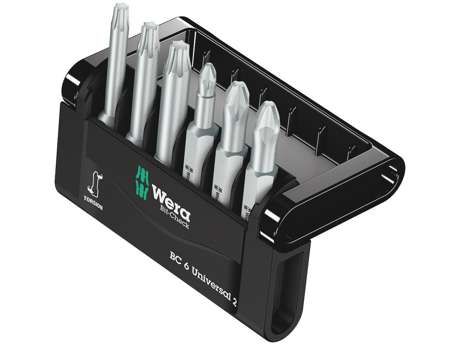 6 50 mm lange Wera bits overskueligt placeret på minimalt areal i praktisk Bit-Check. De hårde og slidstærke bits sind er egnede til universelt brug. Ved Torsion-bits (TZ) affjedres endvidere momenttoppe i Torsionszonen. Slitage før tid undgås, bittens levetid forlænges.