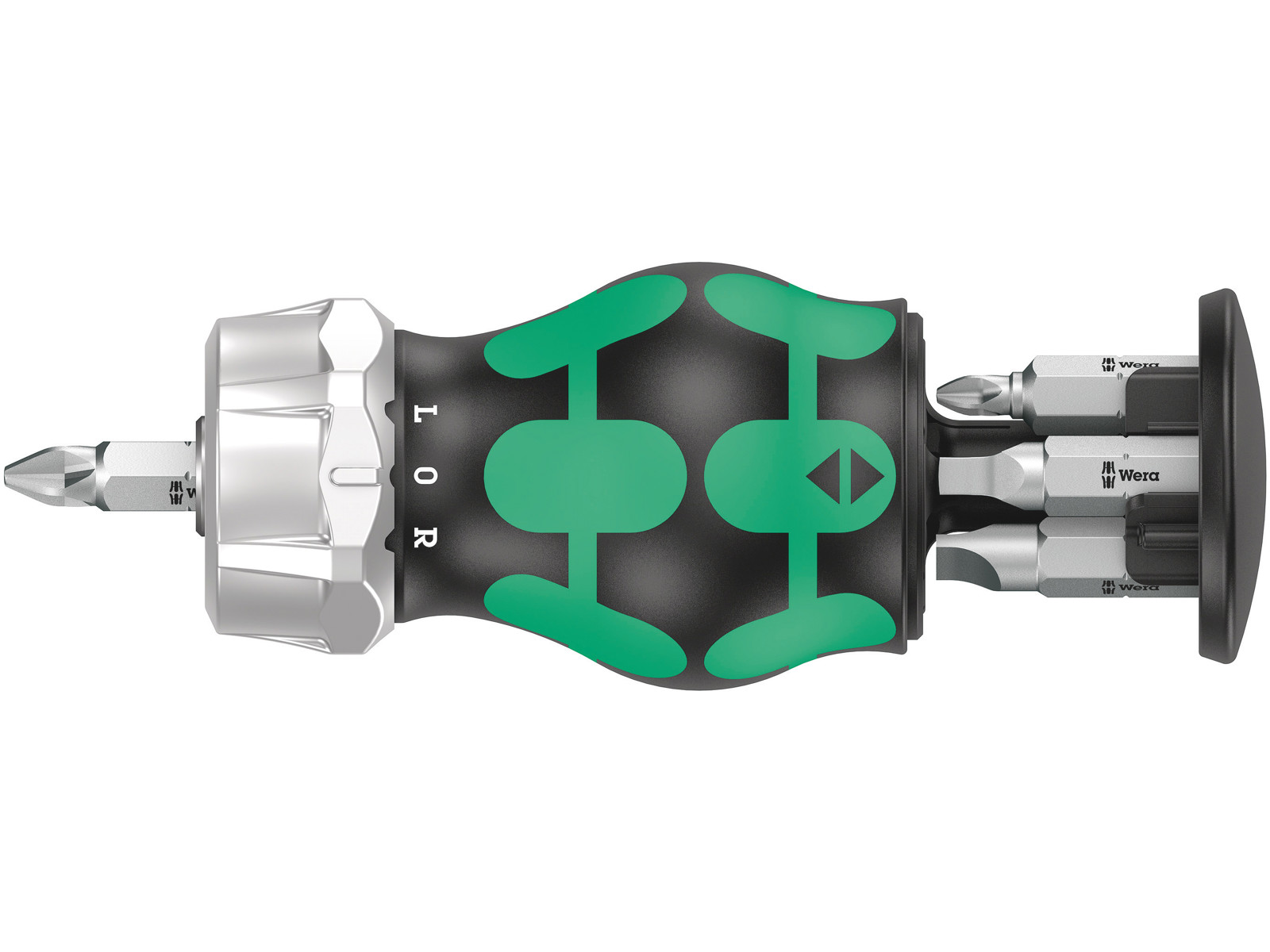 Særligt lille bits-håndgreb med ekstrem kort bitoptag til vanskeligt tilgængelige områder. Med skraldefunktion og finfortanding til en lille returvinkel. Let betjent omskifterring (højre, fast, venstre). Inklusiv 6 hårde og slidstærke universal-bits, der befinder sig i et magasin i håndgrebet. Den stærke magnet i bitoptaget sørger for at bitten sidder sikkert. 2-komponent Kraftform greb med dets praktiske kombination af hårde og bløde zoner gør det muligt at tage ordentligt fat og arbejde præcist.