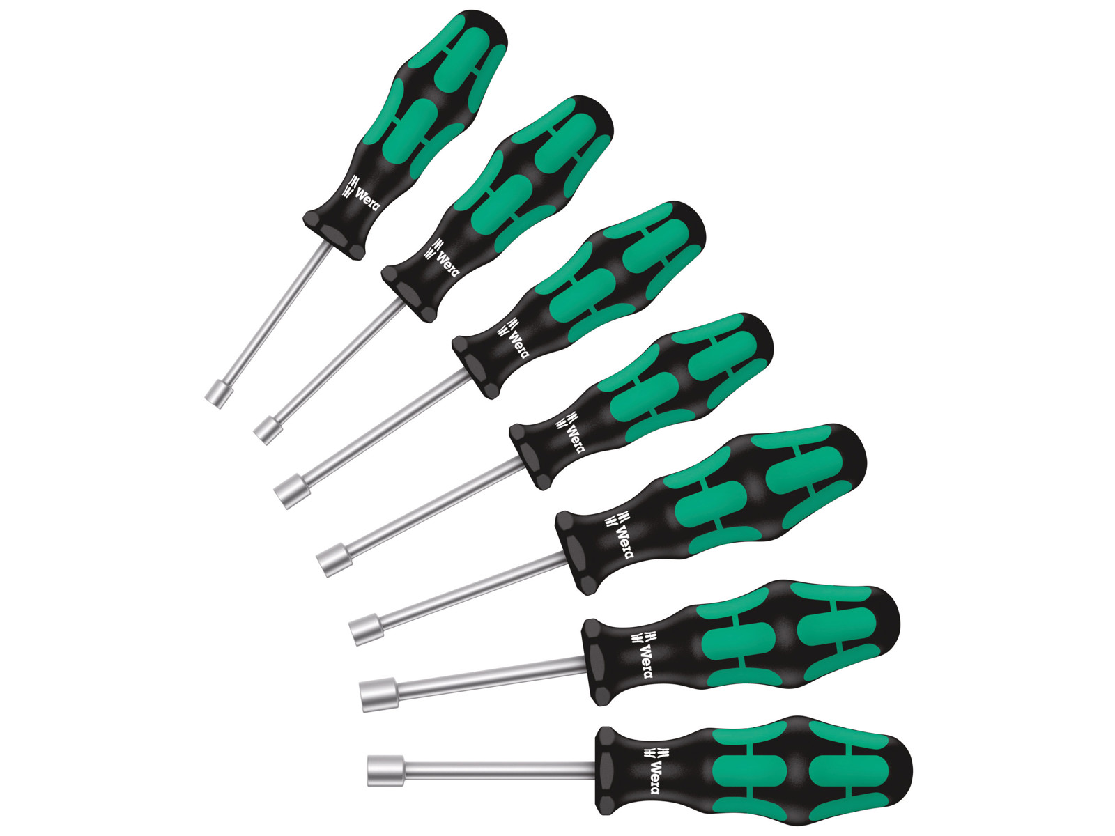 Topnøgle-skruetrækkersæt i 7 dele fra Wera. Hulskaft til skruning ved gevindstænger, for kun da kan gevindstangen via skruemøtrikken trænge ind i skruetrækkerens hule skaft. Flerkomponent Kraftform greb til høj arbejdshastighed og særlig ergonomisk skruning. Sekskantet rullesikring mod rullen væk. Med grebsmarkering, der gør det lettere at finde og sortere værktøjet. Til skruer med udvendig sekskant.