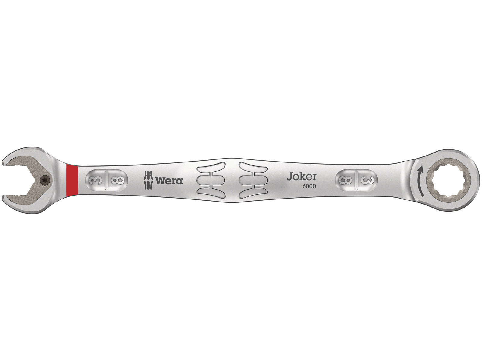 • Kvalitets ringskralde-gaffelnøgle i tommemål fra Wera: Alt hvad en nøgle skal kunne. og meget mere til. Hurtigere, bedre, kønnere. Med andre ord en rigtig Joker. Den nye generation af gaffel-ringskralde-nøgler. Til sekskant-skruehoveder hhv. -møtrikker. Med holdefunktion via metalplade i gaflen, der nedsætter risikoen for at tabe skruer og møtrikker. Den udskiftelige metalplade i gaflen sikrer med ekstra hårde tænder skruer og møtrikker og nedsætter risiken for at rutsje af. Det integrerede slutanslag kan forhindre rutsjen af skruehovedet nedefter og gør det muligt at anvende store momenter. Dobbeltsekskantsgeometrien sørger for formstøbt forbindelse med skrue og møtrik og dermed for nedsættelse af risikoen for at rutsje af. En returvinkel på kun 30° på gaffelsiden hindrer den tidskrævende venden nøglen om under skruningen. Skraldemekanik på ringsiden med usædvanlig fin fortanding på 80 tænder med henblik på fleksibilitet også under snævre forhold. Den specielle smedegeometri sørger for stor momentoverførsel og stor bøjningsstyrke. Fremstillet af højtydende krom-molybdæn-stål med nikkel-krom belægning med henblik på høj korrosionsbeskyttelse. Med værktøjsfinderen Take it easy: Farvemærkning efter størrelse.