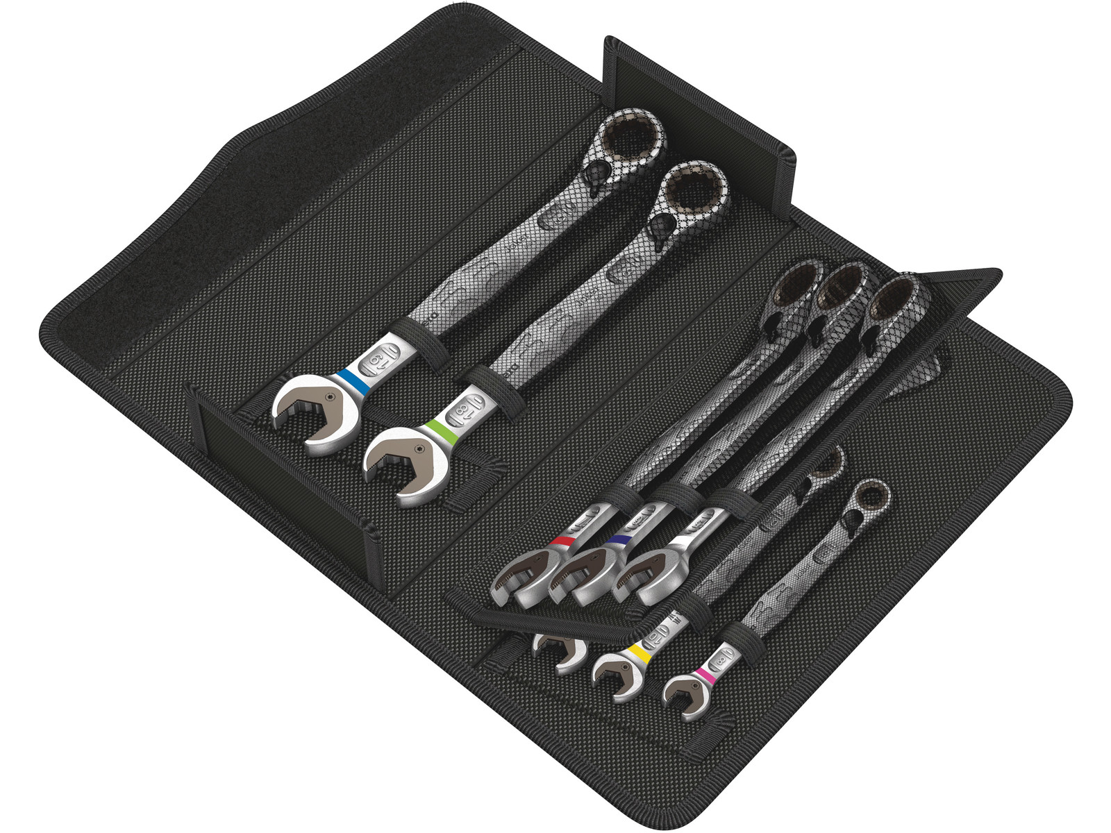Kvalitets ringskralde-gaffelnøgle-sæt fra Wera: Joker gaffelringskraldenøgler med skraldeside i vinkel og omskifterknap. Med holdefunktion via metalplade i gaflen, der nedsætter faren for at tabe skruer og møtrikker. Det integrerede slutanslag kan forhindre, at man rutsjer ned af skruehovedet, og giver mulighed for at tilføre store momenter. Den udskiftelige metalplade i gaflen sikrer skruer og møtrikker med ekstrahårde tænder og nedsætter faren for at rutsje af. Den dobbelte sekskantsgeometri sørger for formtilpasset forbindelse med skrue eller møtrik og dermed ligeledes for en nedsættelse af faren for at rutsje af. Den lille returvinkel på kun 30° på gaffelsiden hindrer tidskrævende venden rundt på nøglen under skruningen. Den omskiftelige skraldemekanik på ringsiden med høj finfortanding (80 tænder) sørger for en høj grad af fleksibilitet også under snævre arbejdsforhold. Hørbart præcis skraldemekanik. Det robuste todelte hak-element giver derudover mulighed for ekstrem holdbarhed. Skraldesiden er vinklet med 15° mhp. sikkert arbejde ved store momenter. Den særlige smedjegeometri sørger for både stor momentoverførsel og høj bøjningsstyrke. Fremstillet af højtydende krom-molybdæn-stål med nikkel-krom belægning mhp. høj korrosionsbeskyttelse. Med værktøjsfinderen Take it easy: Farvemærkning efter størrelse.