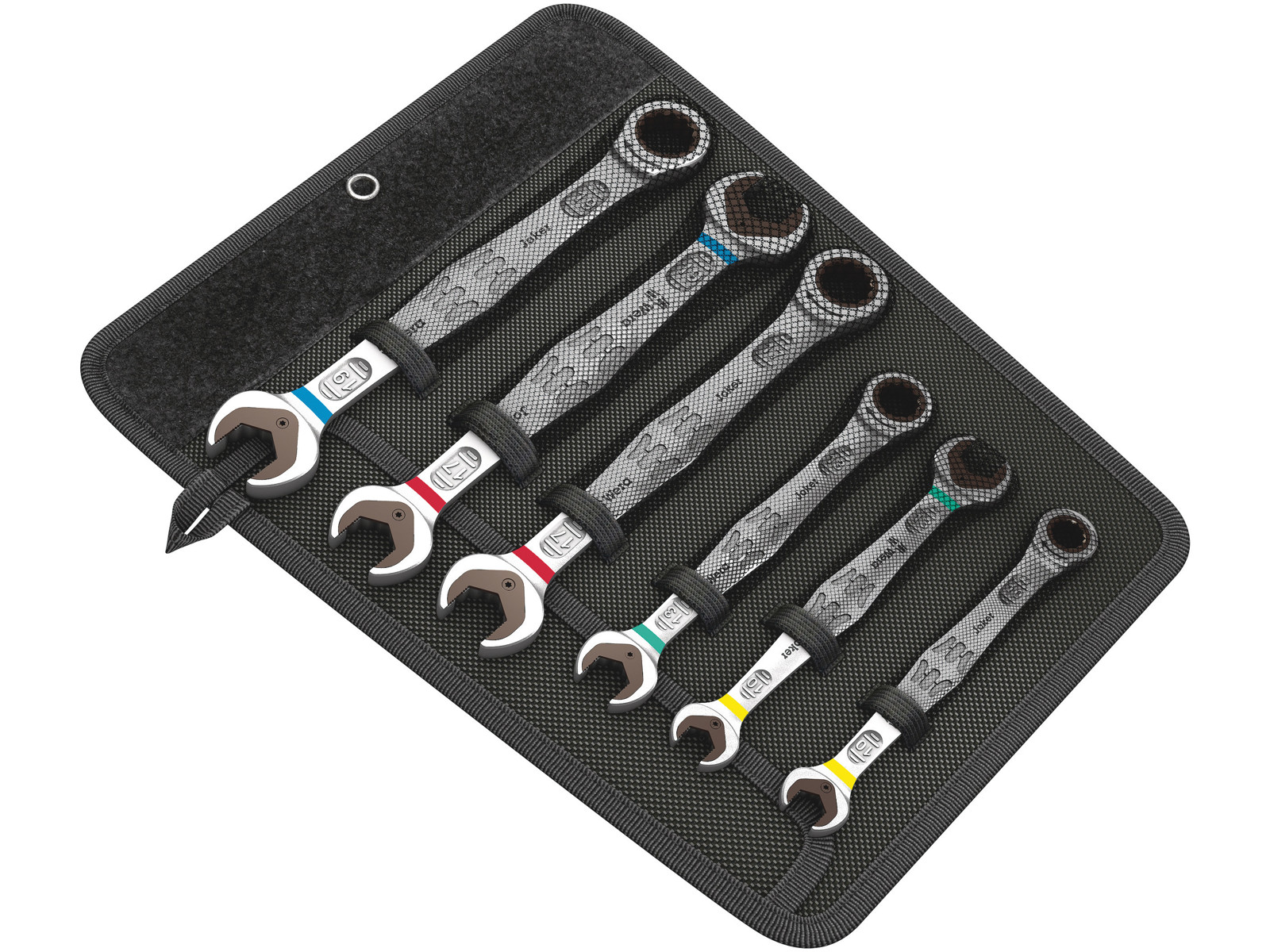 Kvalitets ringskralde-gaffelnøgle-sæt fra Wera: Alt, hvad en nøgle skal kunne. og meget mere til. Hurtigere, bedre, kønnere. Netop en rigtig Joker. Den nye generation af gaffel-ringskralde-nøgler. Sæt i 6 dele i robust taske. 4 nøgler med gaffel- og skraldeende i henholdsvis samme nøglestørrelse. 2 nøgler med gaffel i begge ender i forskellige størrelser. Til sekskant-skruehoveder hhv. -møtrikker. Med holdefunktion via metalplade i gaflen, der nedsætter faren for at tabe skruer og møtrikker. Den udskiftelige metalplade i gaflen fastholder med ekstra hårde tænder skruer og møtrikker og nedsætter faren for at rutsje af. Det integrerede slutanslag kan forhindre, at man rutsjer ned fra skruehovedet og muliggør pålægning af større momenter. Den dobbelte sekskantgeometri sørger for en formtilpasset forbindelse med skrue og møtrik og dermed for nedsættelse af faren for at rutsje af. En returvinkel på kun 30° på gaffelsiden hindrer tidskrævende venden nøglen om ved skruning. Skraldemekanik på ringsiden med usædvanlig høj finfortanding på 80 tænder giver fleksibilitet i snævre montagesituationer. Den specielle smedegeometri sørger for stor momentoverførsel og høj bøjningsstyrke. Fremstillet af højtydende krom-molybdæn-stål med nikkel-krom belægning for høj korrosionsbeskyttelse. Die neue Generation der Maul-Ringratschen-Schlüssel. Med værktøjsfinderen Take it easy: Farvemærkning efter størrelse.