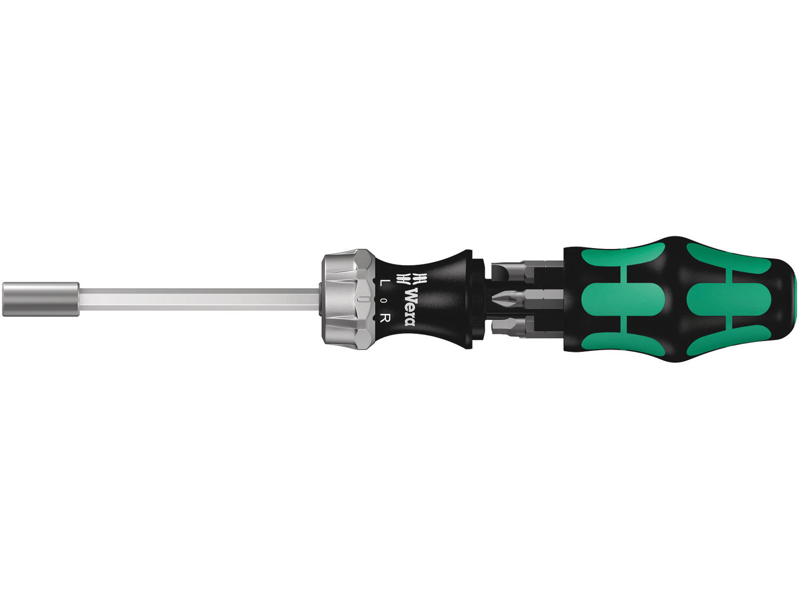Wera Kompaktværktøj med flerkomponent Kraftform greb til høje arbejdshastigheder og særlig ergonomisk skruning. Integreret bit-magasin i grebet. Inkl. skralde: Finfortanding til lille returvinkel, omskifterring (højre, fast, venstre), maksimalt moment på op til 50 Newtonmeter; sekskants-klinge med 1/4"-indvendig sekskantstilslutning, bøsning i rustfri stål, stærk permanent magnet.