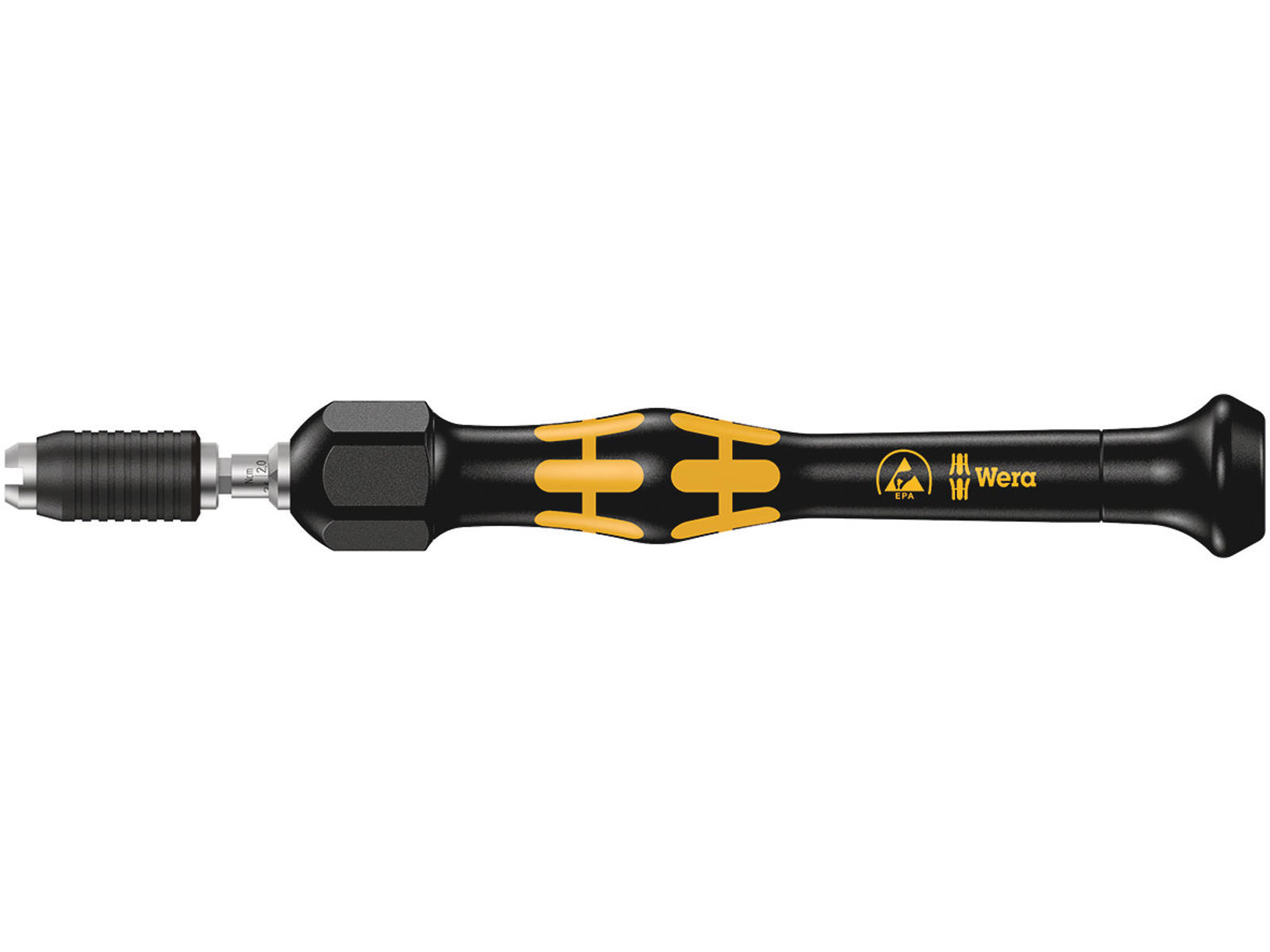• Momentværktøj med indstilleligt moment på 2,0 til 6,0 cNm (præcision ± 10%). Kompakt grebs-/udskiftningsklinge-system til momentkontrollerede finskruninger. Kraftform Micro ESD momentskruetrækker er ideel til momentkontrolleret skruning på elektrostatisk udsatte komponenter. Egnet til påsætning af bits med 4 mm Halfmoon-tilslutning (Wera serie 9) og bits med 4 mm HIOS-tilslutning (Wera serie 21). Manipuleringsbeskyttet. Tydeligt hør- og mærkbart klikken over, når det indstillede moment nås. Ubegrænset manuelt løsningsmoment. Elektrisk overflademodstand ≤ 109 Ohm til sikker beskyttelse mod elektrostatisk energi. Fremstillet i henhold til DIN EN 61340-5-1. Grebs-/udskiftningsklinge-system til lynhurtigt klingeskift. Kraftform Micro greb med drejelig kappe og lyndrejezone til lynhurtig snurren rundt, ingen tidskrævende tagen fat på ny mere. Kraftzone med integrerede bløde zoner til overførsel af større løsnings- og spændingsmomenter. Præcisionszone direkte over klingen til den rigtige drejevinkel ved justeringsarbejde. Lynhurtig bit-fiksering: Skub blot bitten ind i tilslutningen, låser selv fast, sikker placering. Til bitskift skydes bøsningen fremefter og bitten kan tages ud. Fritløbende bøsning til enkel føring af værktøjet under skruningen. Bits egnet til manuel og maskindrevet skruning med el-skruemaskiner (bl. a. HIOS, Delvo, Sehan). Bruges f.eks. på smartphones, mobiltelefoner, kameraer, elektronikudstyr, i tandtekniske laboratorier og tandlægeklinikker.