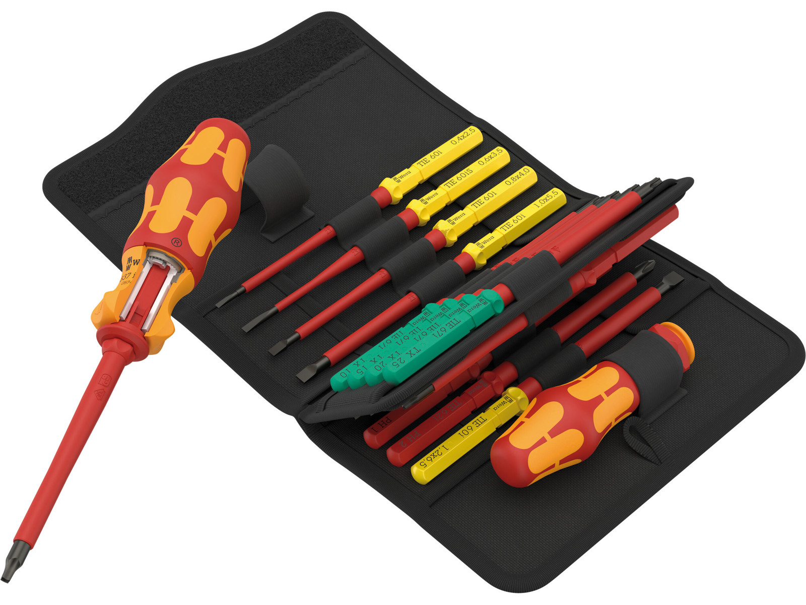 • Kraftform Kompakt VDE sæt i 17 dele. 1 håndgreb 837 i RA med skraldefunktion (40 tænder, 9° returvinkel), 1 håndgreb 817 VDE, 15 VDE-udskiftningsklinger med værktøjsfinderen Take it easy: Farvemærkning efter profiler og laserindgraveret størrelse. Stykvis testet værktøj iflg. IEC 60900. Stykvis test i vandbad ved 10.000 V til sikkert arbejde ved den godkendte spænding på 1.000 V. I robust bæltetaske.