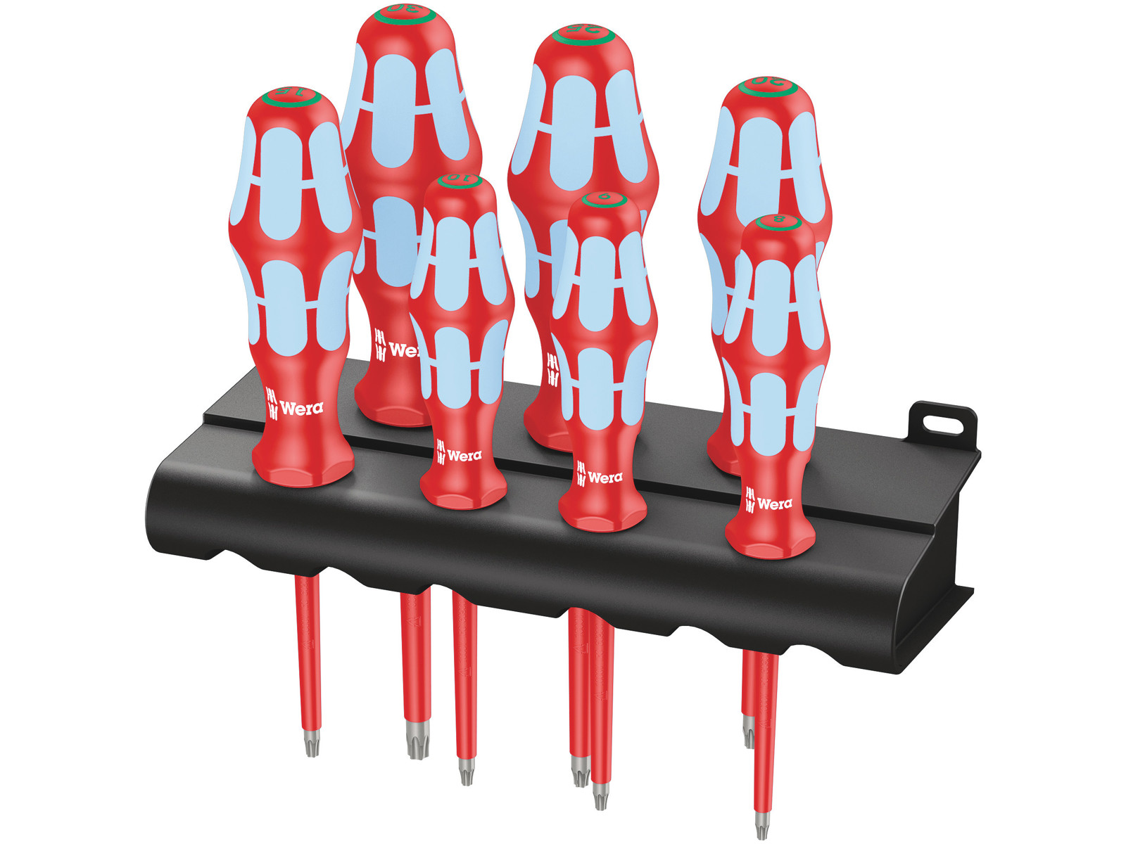VDE-skruetrækker-sæt i rustfri stål i 7 dele. Værktøj i rustfri stål fra Wera er vakuumhærdet og har derfor den nødvendige hårdhed og fasthed til skrueforbindelser. Industriel brug er mulig uden begrænsninger. Den stykvise testning af Kraftform Stainless VDE skruetrækkere ved 10.000 Volt ifølge DIN EN 60900 (IEC 60900) garanterer sikkert arbejde ved spænding op til 1.000 Volt. Også ved ekstreme anvendelsesbetingelser er sikkerheden garanteret via den testede modstandsdygtighed mod kulde ved -40 °C. Flerkomponent Kraftform greb til hurtigt og skånsomt arbejde. Take it easy værktøjsfinder med farvemærkning efter profiler og påstemplet størrelse - gør det lettere og hurtigere at finde det rigtige værktøj. Den sekskantede rullesikring forindrer irriterende rullen væk på arbejsstedet.