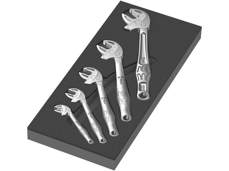 Skumgummiindsats med lang levetid; 2-farvet så manglende dele hurtigere ses; egnet til Tool Rebel værktøjsvognen; udstyret med 5 selvjusterende gaffelnøgler Wera 6004 Joker.