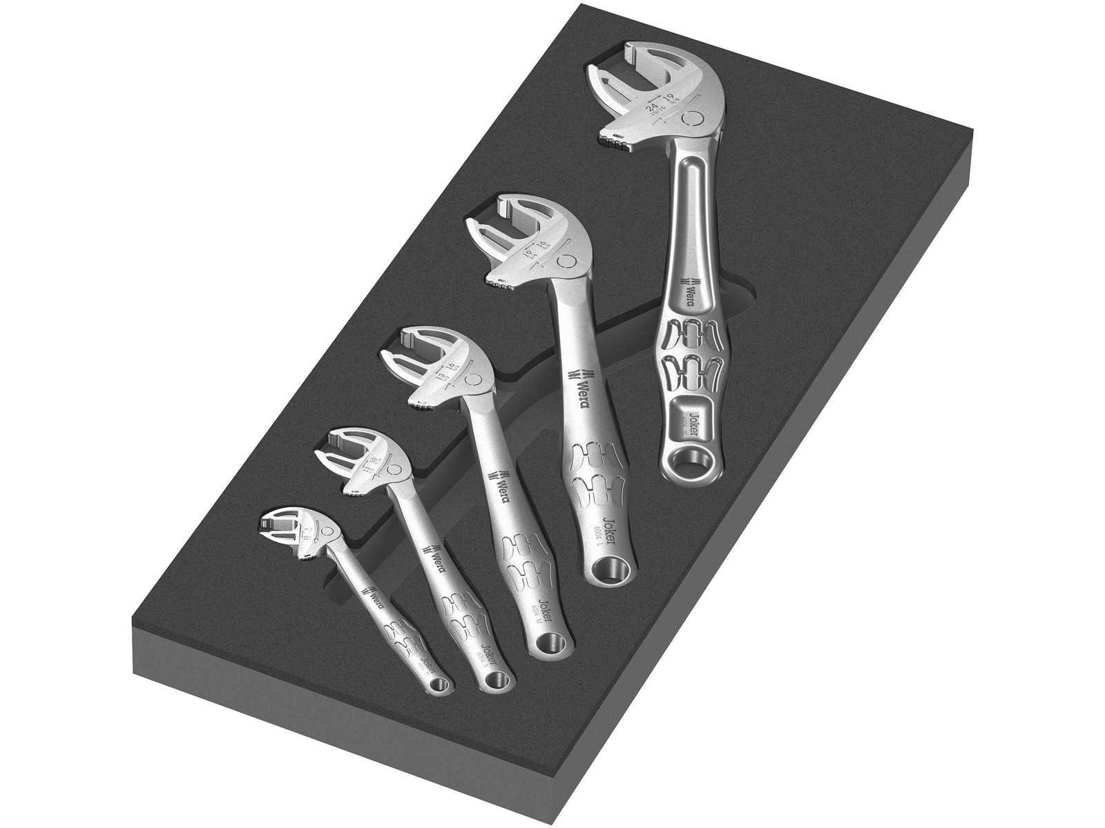 • Skumgummiindsats med lang levetid; 2-farvet så manglende dele hurtigere ses; egnet til Tool Rebel værktøjsvognen; udstyret med 5 selvjusterende gaffelnøgler Wera 6004 Joker.