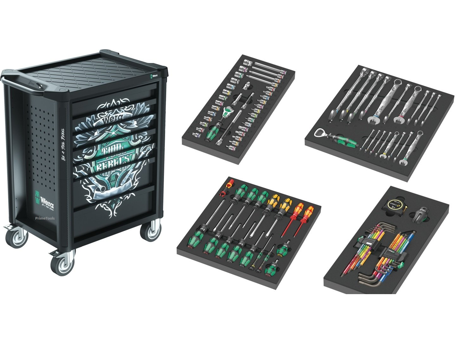 Eksklusiv værktøjsvogn i Tool Rebel design. 5 flade og 2 dybe skuffer sørger for effektiv, mobil organisation af værktøj og materiale. Ekstrem robust udførelse via dobbeltvægget udførelse og komplet svejst konstruktion af hele korpus. Til den daglige hårde insats på værkstedet. Udstyret med 4 Wera skumgummiindsatser: 9710 skumgummiindsats skruetrækker sæt 1, 9720 skumgummiindsats 8000 A Zyklop skralde sæt 1, 9731 skumgummiindsats 6003 Joker ringgaffelnøgle sæt 1, 9740 skumgummiindsats vinkelnøgle sæt 1.