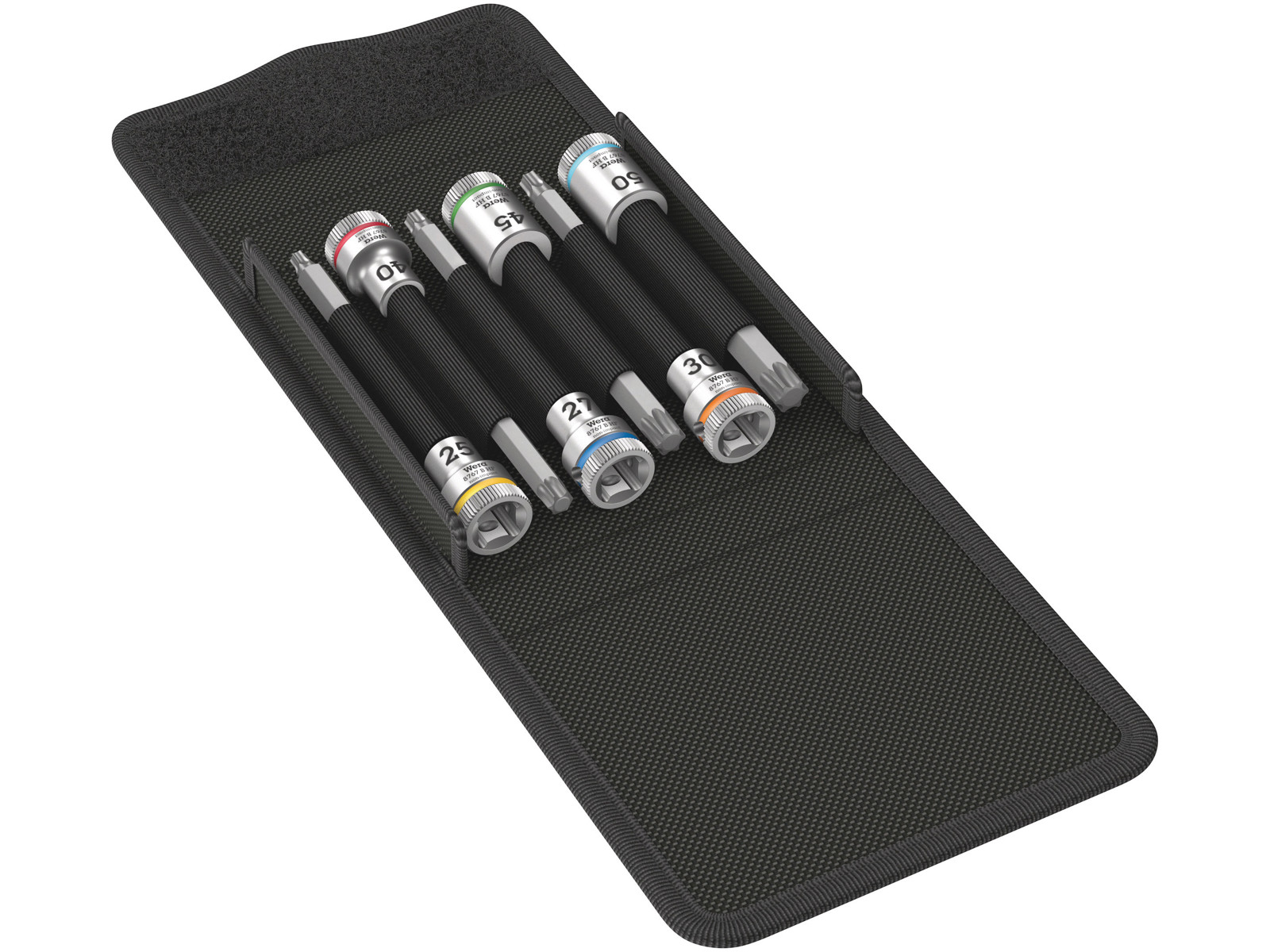 Zyklop bit-top-sæt med Torx og holdefunktion. Bittop med 3/8" tilslutning og holdefunktion til særlig komfortabel skruning med reduceret risiko for at tabe skruen på vejen til arbejdsemnet. Med Take it easy værktøjsfinder med farvemærkning efter størrelse - der gør det lettere og hurtigere at finde det rigtige stykke værktøj. 7 dele: TX25×107 mm, TX27×107 mm, TX30×107 mm, TX40×107 mm, TX45×100 mm og TX50×100 mm.