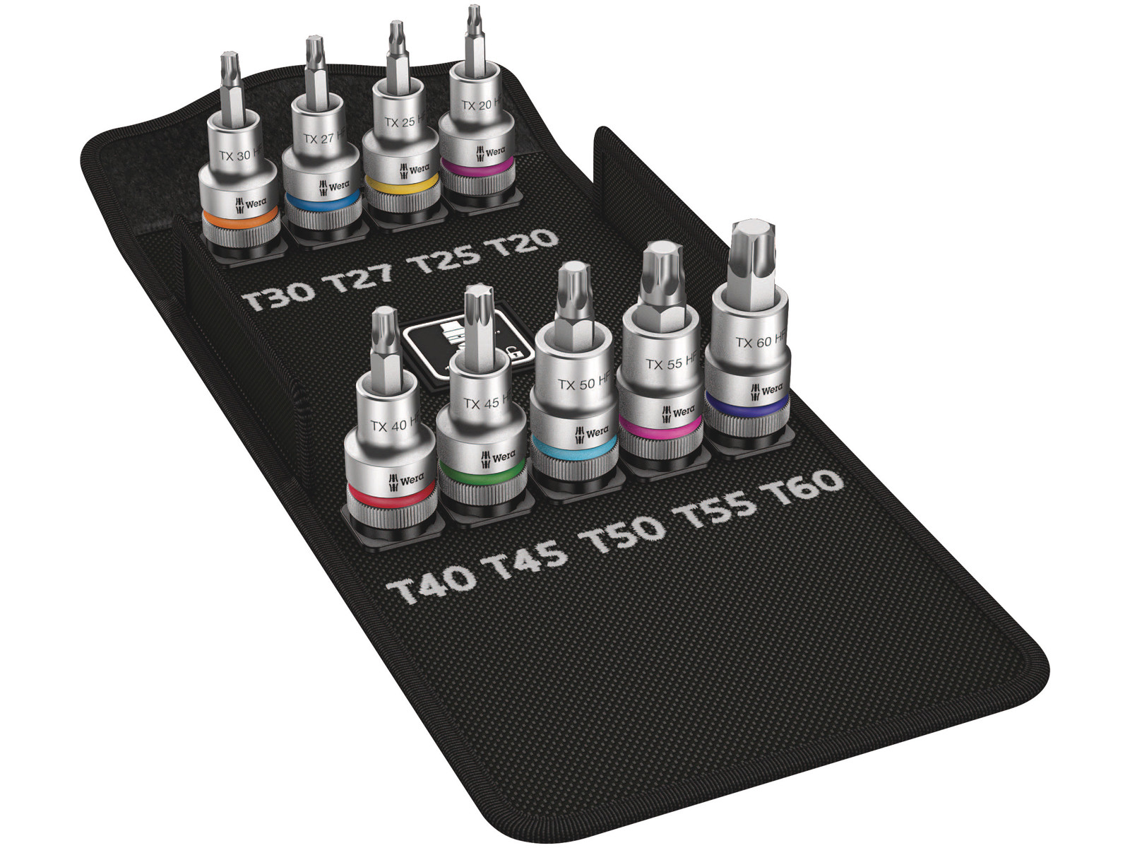 1/2" stifttopsæt med ni hånd- og maskintoppe til Torx-skruer. Sættet indeholder Zyklop bit-toppe med 1/2"-tilslutning, TX20/25/27/30/40/45/50/55/60 × 60 mm. Stifttoppe med holdefunktion til skruer. Letgående drejemekanisme for sikkert hold og let udtagning af værktøjet. Med farvemærkning efter størrelse. Leveres i let og robust, kompakt tekstilboks.