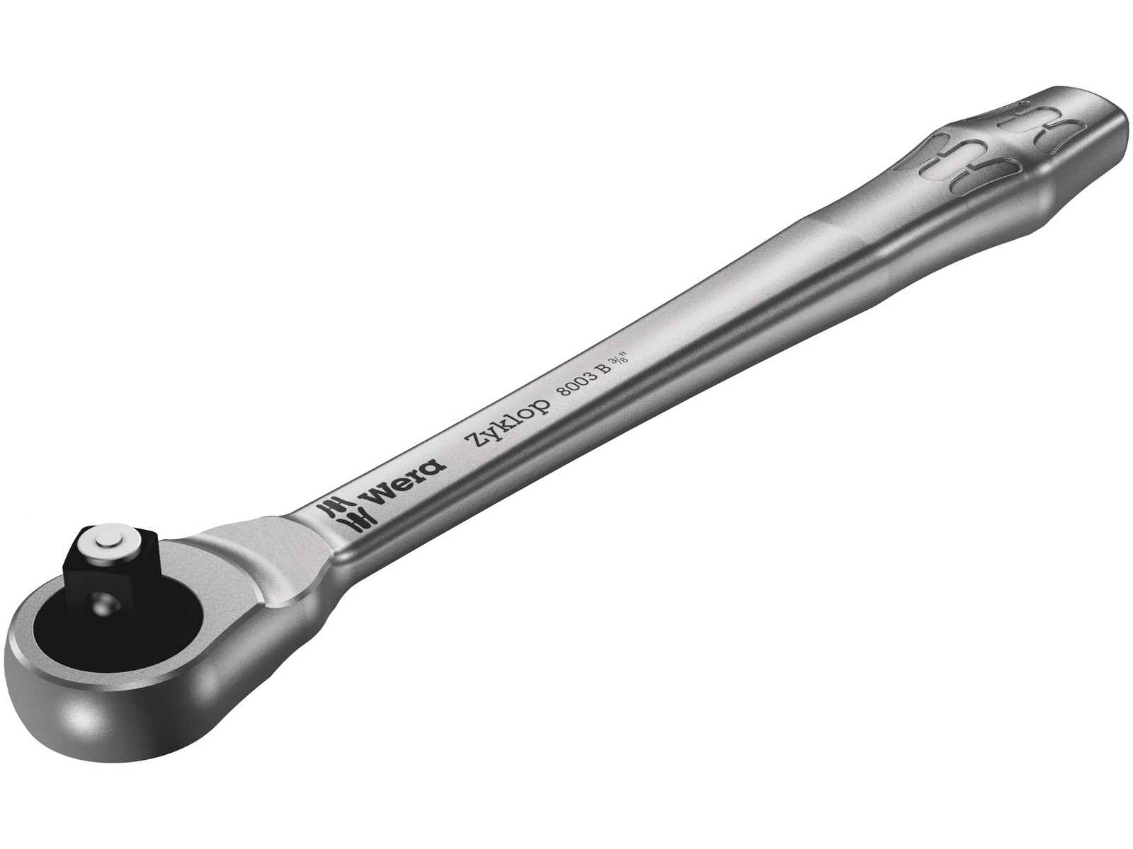 Skralden Zyklop Metal med gennemstiksfirkant. Slank form til arbejde også under snævre montageforhold. Via dobbeltklinkekonstruktionen muliggør 38 robuste tænder en 76er finfortanding med en returvinkel på kun 4,7°. Meget letgående retningsskift via utabelig gennemstiksfirkant og for første gang også med en sikker toplåsefunktion. Smedet helmetalskralde (krom-molybdæn) til særlig stor robusthed ved lang levetid.
