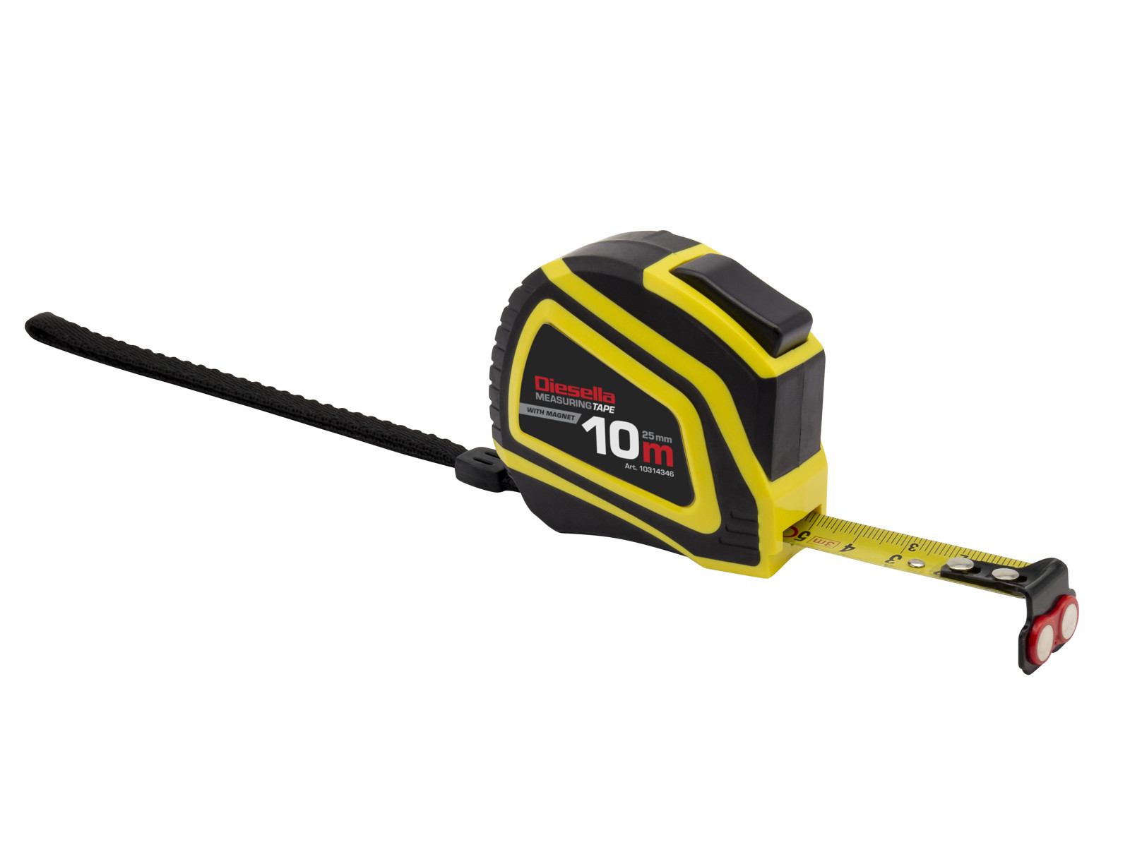 Lightweight and durable prof. tape measure with Auto-lock. With yellow tape measure, black mm-scale, red numbers every 10 cm and magnet.