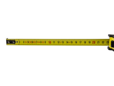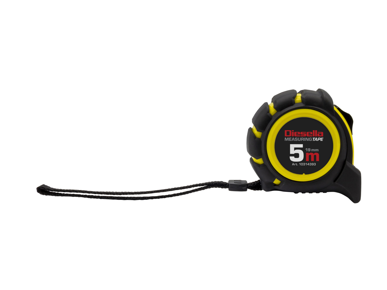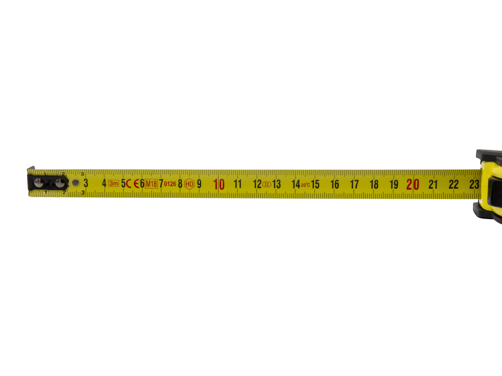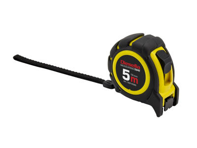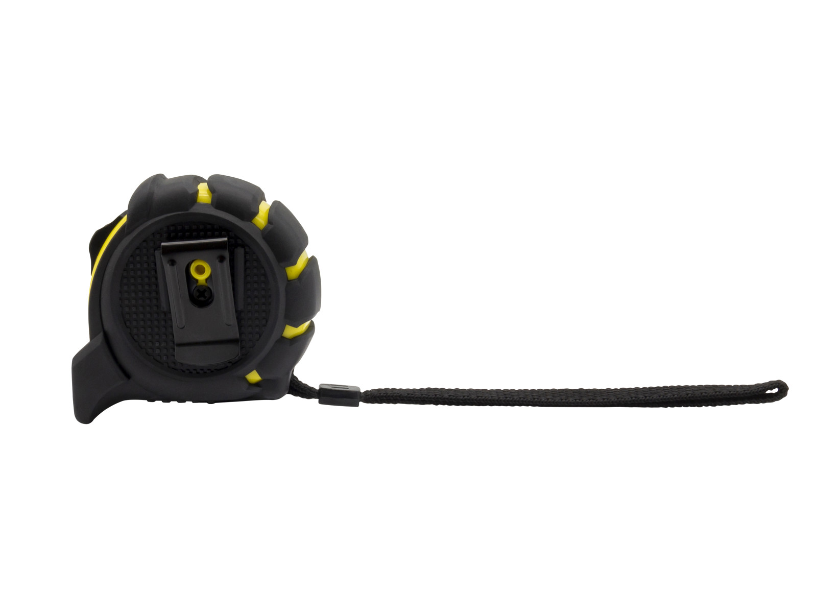 Robust prof. tape measure with Power-lock. With yellow tape measure, black mm-scale and red numbers for every 10 cm. The housing is rubber coated for extra protection. Thickness 0.14 mm.