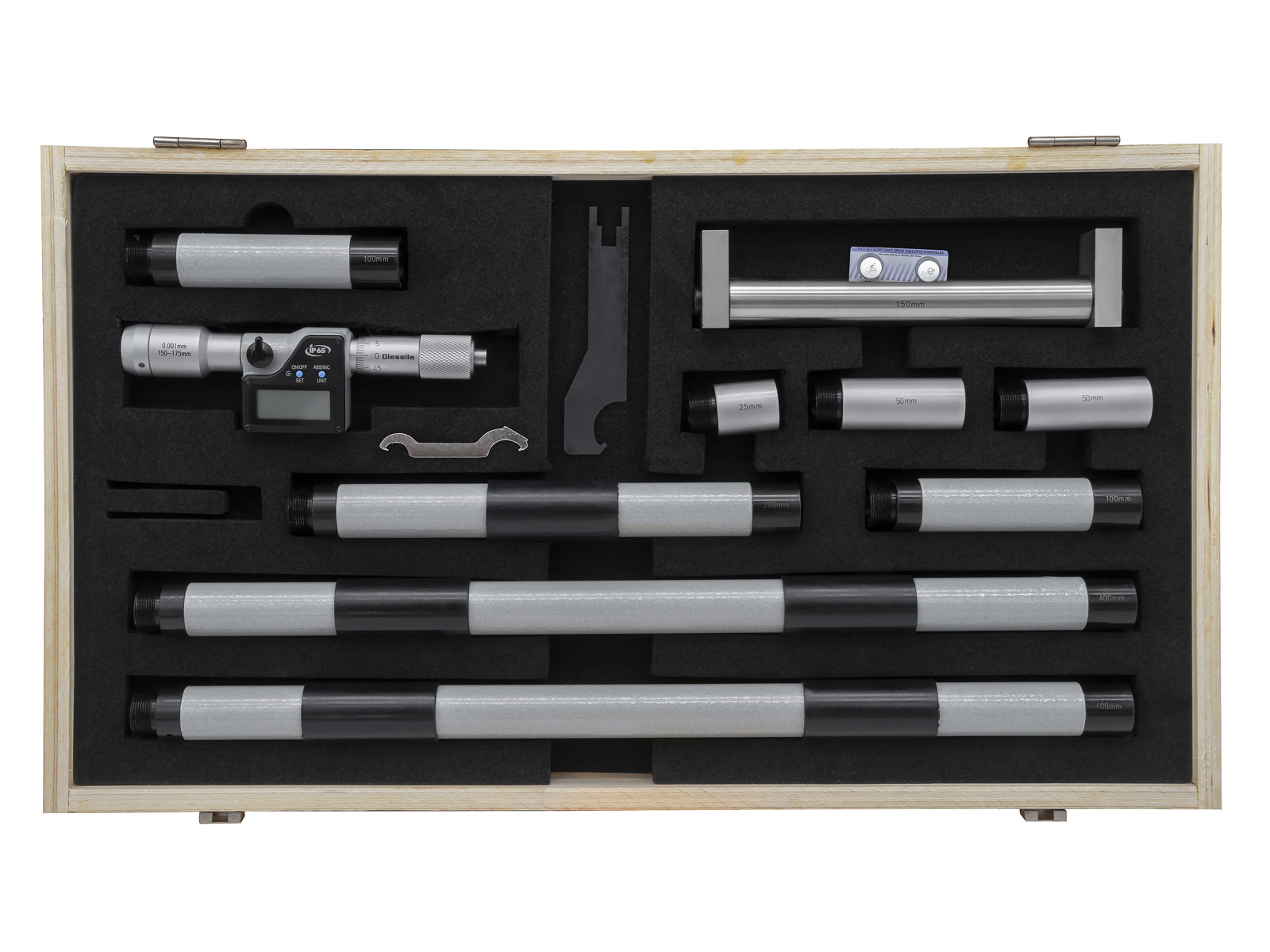• Digital micrometer for internal measurement with replaceable extensions for large measuring ranges up to 175 mm. Extensions are made in pipe design with carbide-coated measuring surfaces. Delivered in wooden box. Battery: 1xLR44 included. • Measuring range 150-1500 mm • Interchangeable extensions • Multiple sets can be assembled for alternate lengths