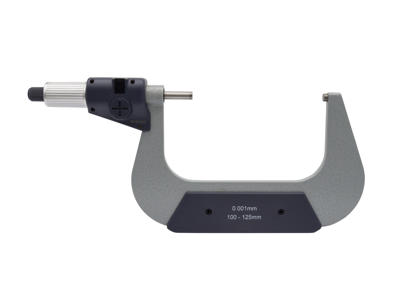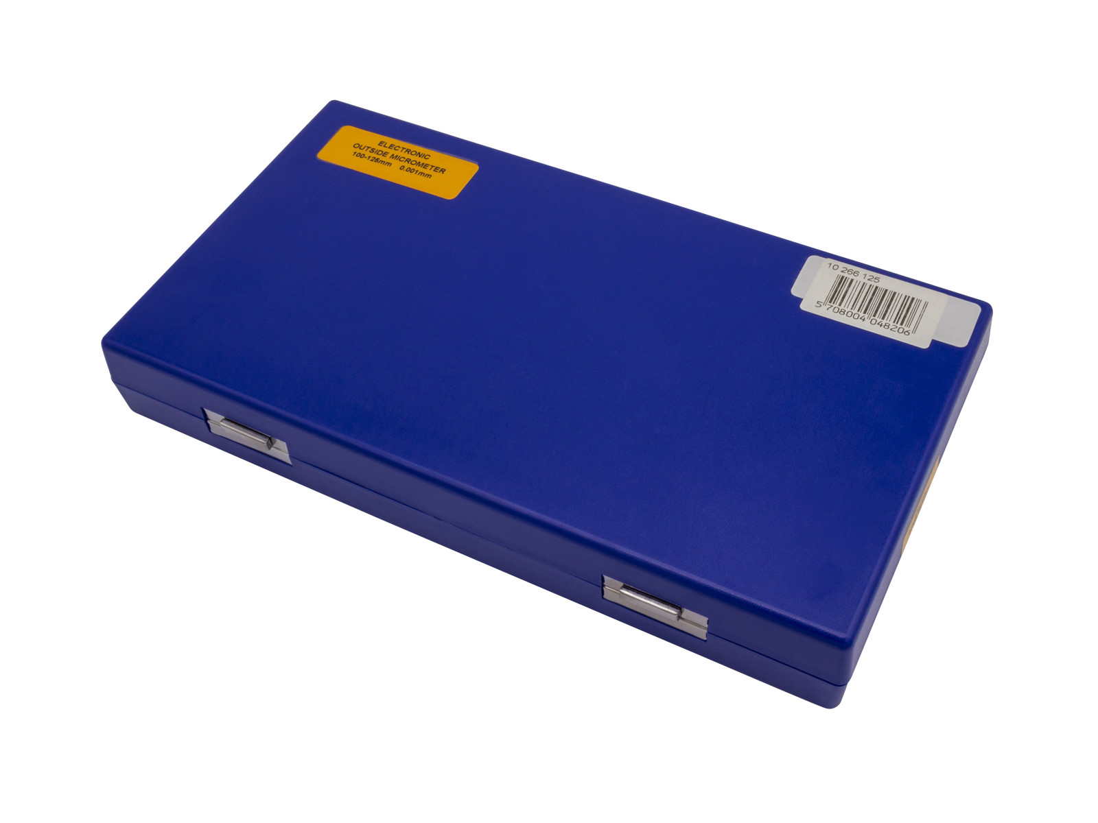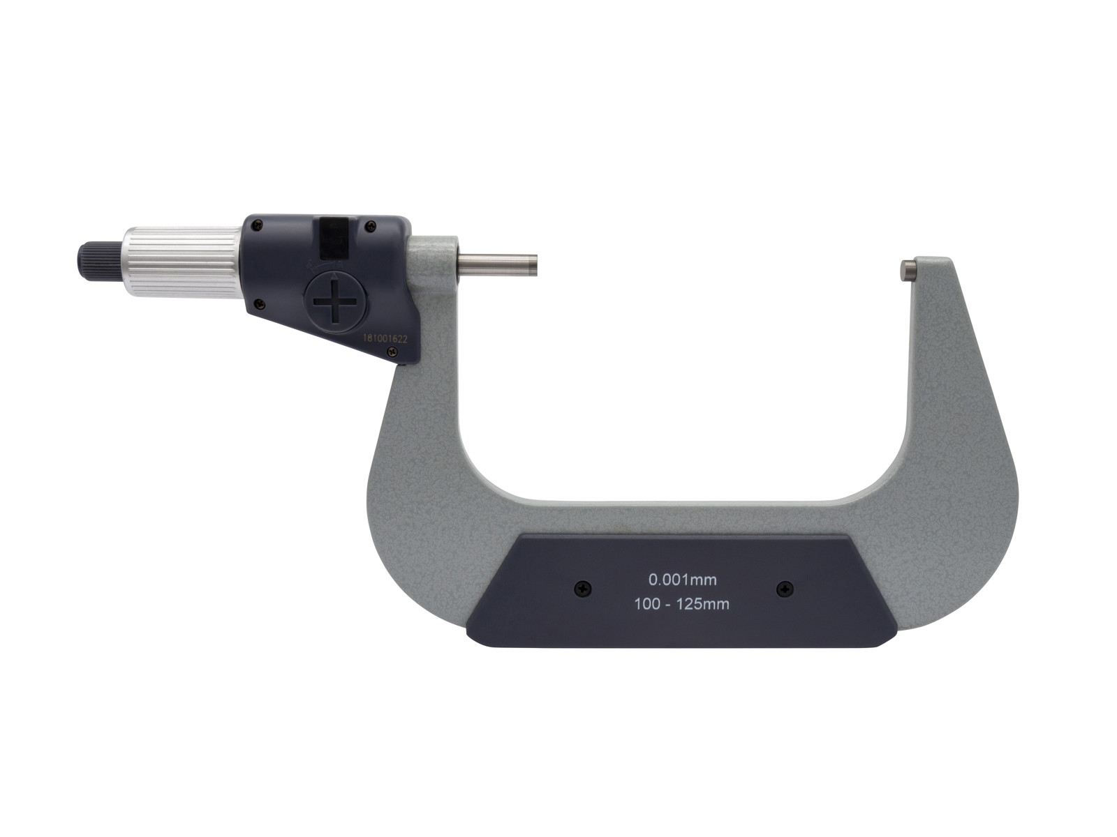 • Solid digital outside micrometer screw. DIN 863. Measuring range 100-125 mm. ABS function. Matt chrome-plated with tungsten carbide measuring surfaces, lacquered insulated frame, switch mm./Inch, reset. Reading: 0.001 mm. Delivered in a wooden box. Battery: 1xLR44 included. • Measuring range: 100-125 mm • ABS function • Matt chrome-plated • Tungsten carbide measuring surfaces • Lacquered and insulated frame • Inspection standards included